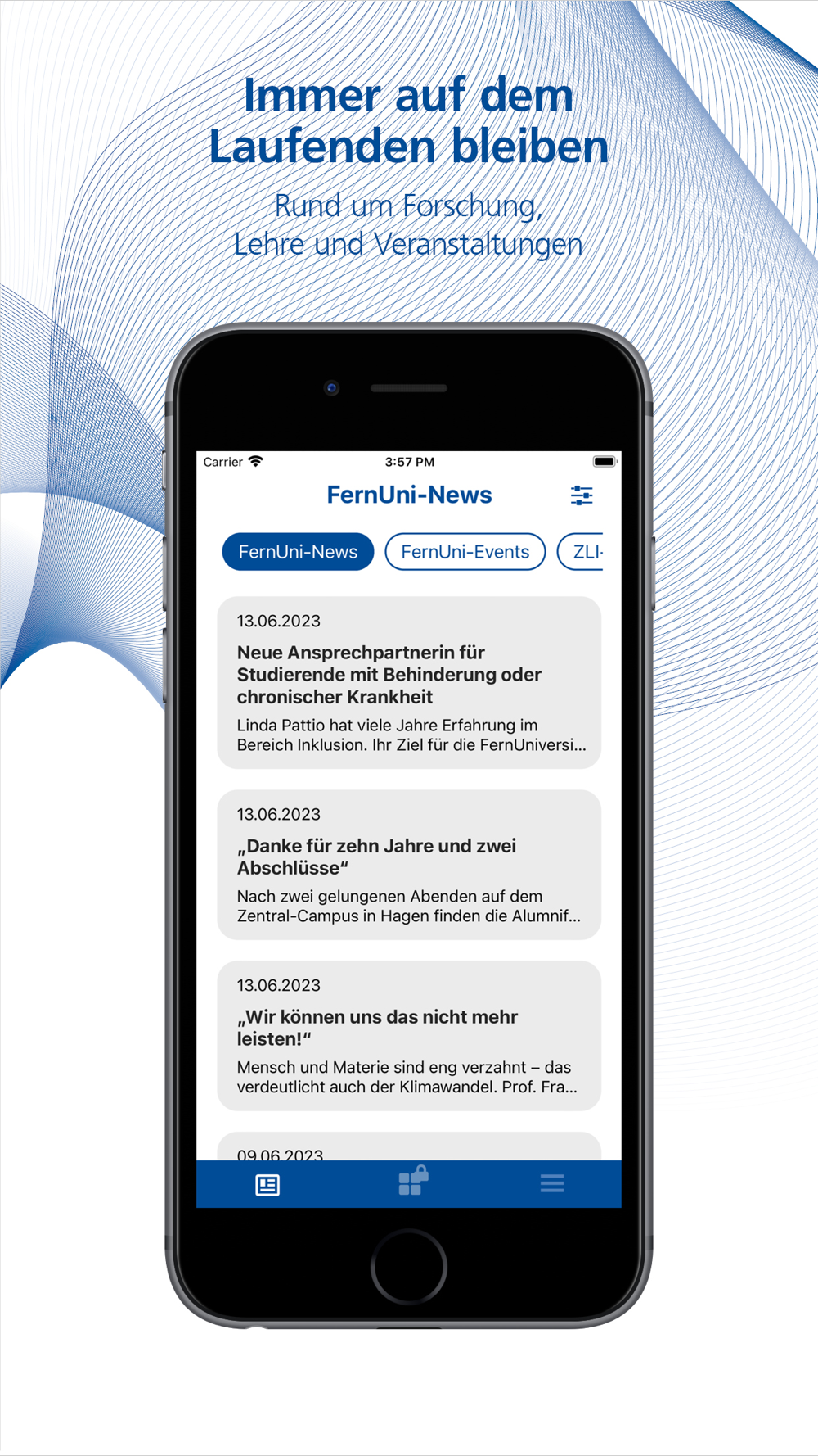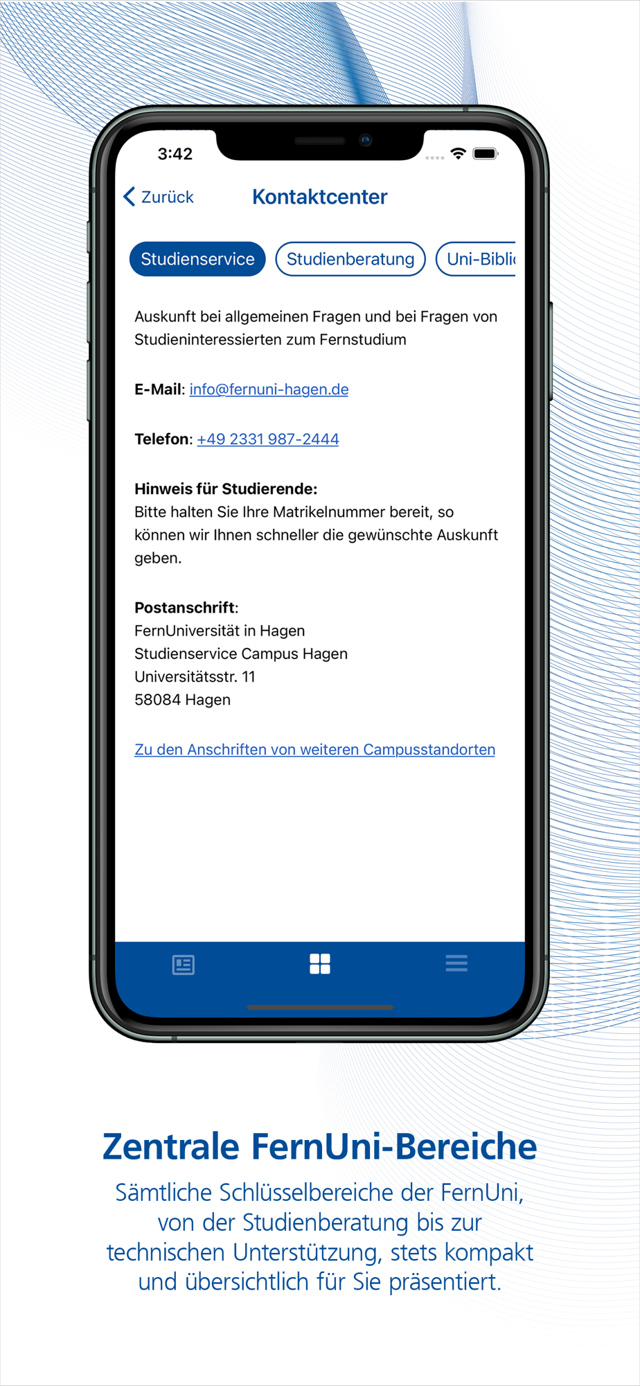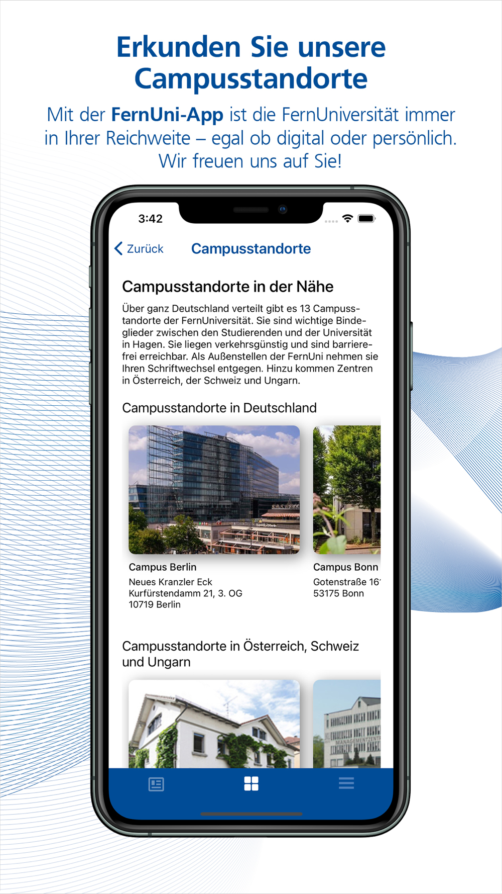 Wichtige Dienste aus dem Studienalltag an der FernUniversität in Hagen gebündelt auf dem Smartphone? Das geht mit der FernUni-App. Mit ihrem intuitiven Design und der übersichtlichen Bedienoberfläche bietet sie Ihnen einen einfachen Zugang zu wichtigen Informationen und Tools.