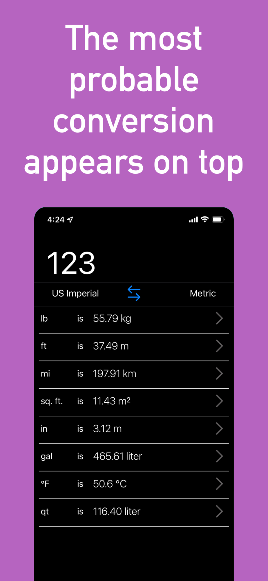 Get the most relevant every-day conversions by just entering the number that you want to convert. No more selecting category and units - just enter the value and find your result.