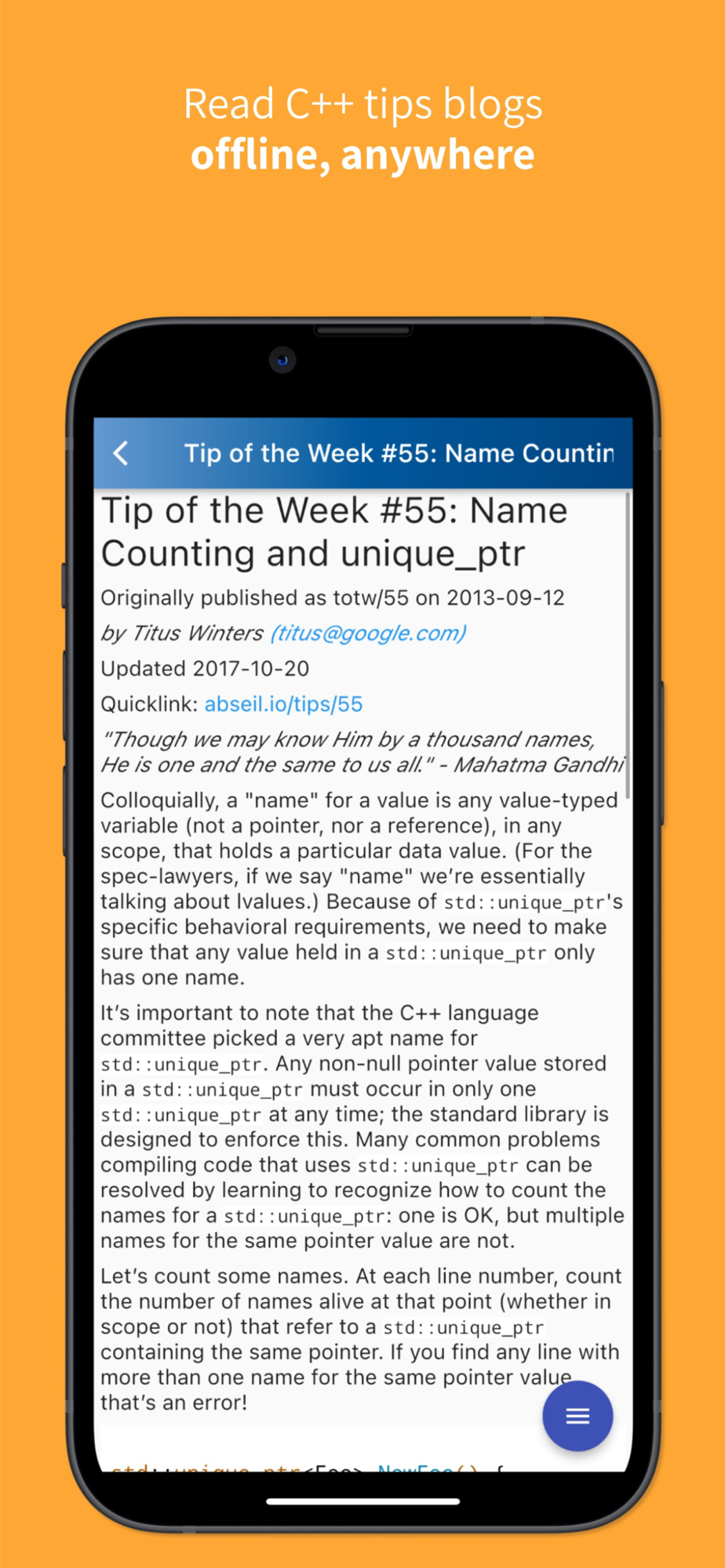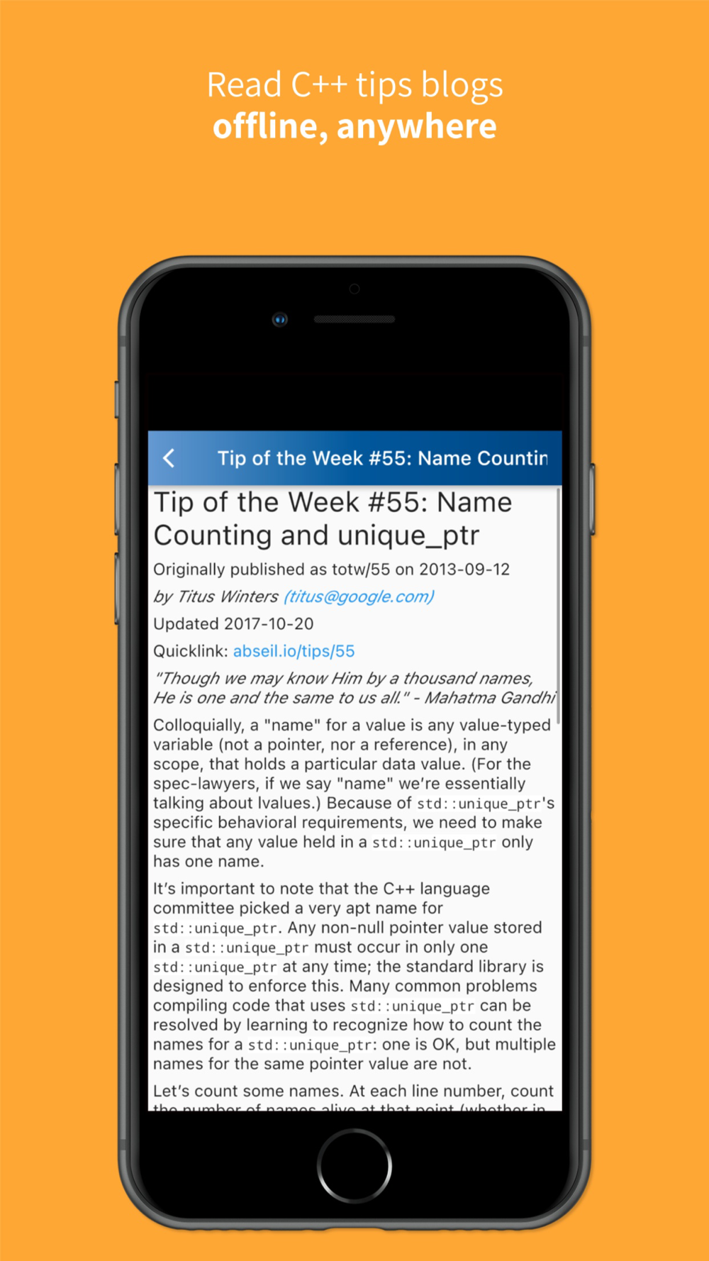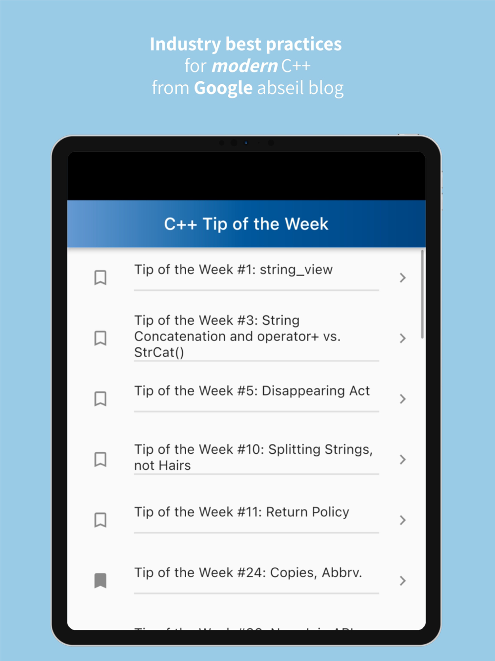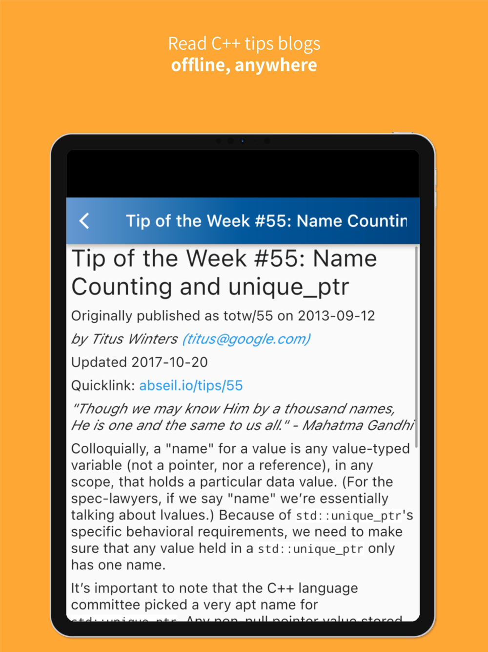 More than 60 articles on modern C++, entirely offline. Learn the best industry practice on your phone or tablet!