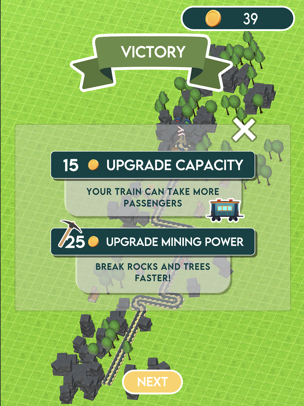 Tap to gather ressources, clear the way and build your track, to get as many passengers to their destination as possible!