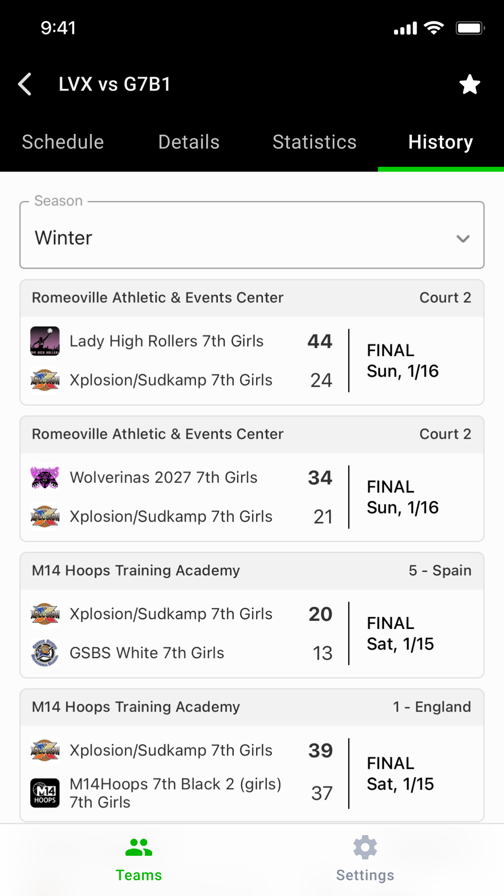 Key features include: team search, schedule notification, venue navigation, and statistical match-up comparisons, and bracket progress