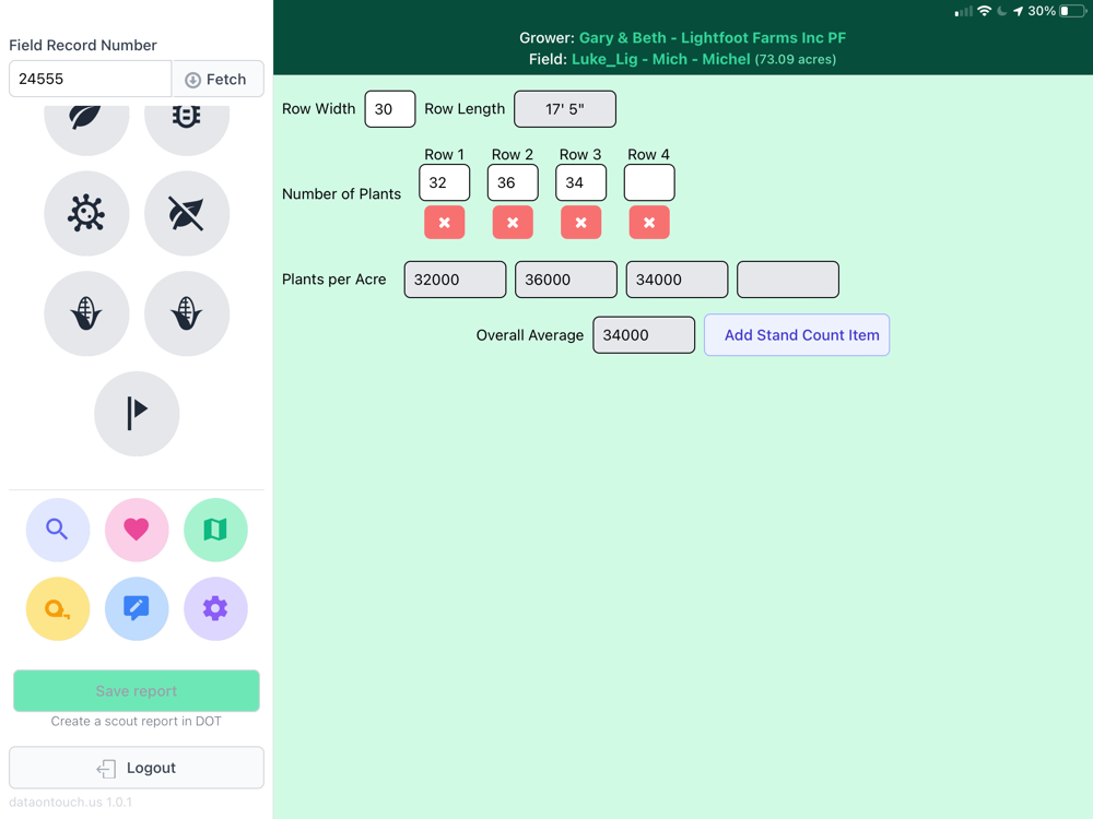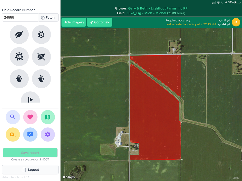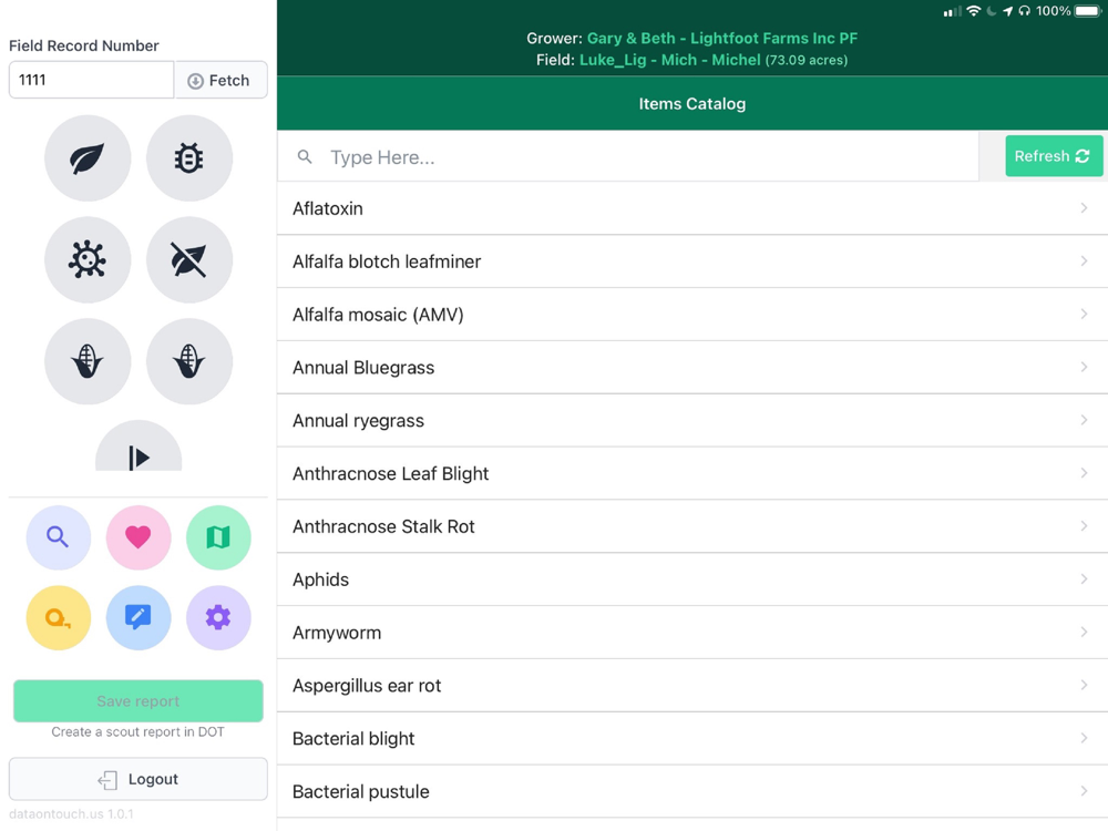 A user interface for DataOnTouch customers to create scouting reports. This is a simple tool to collect information about weeds, diseases, insets and disorders.