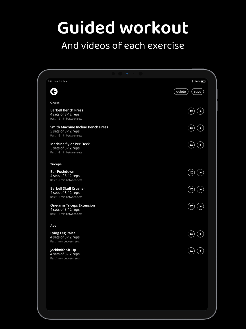- Generate workouts for Chest, Back, Shoulders, Biceps, Triceps, Legs & Abs