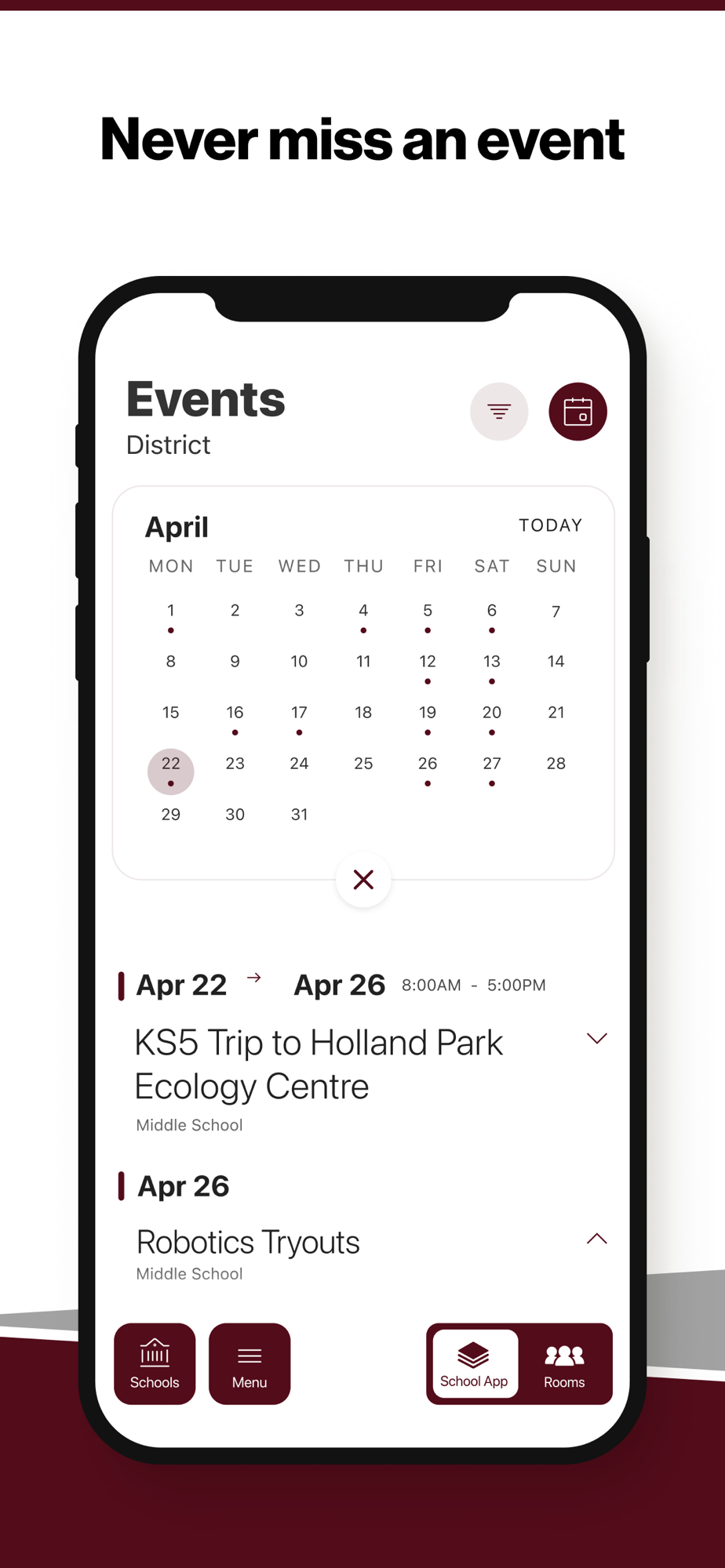 The event section shows a list of events throughout the district. Users can add an event to their calendar to share the event with friends and family with one tap.