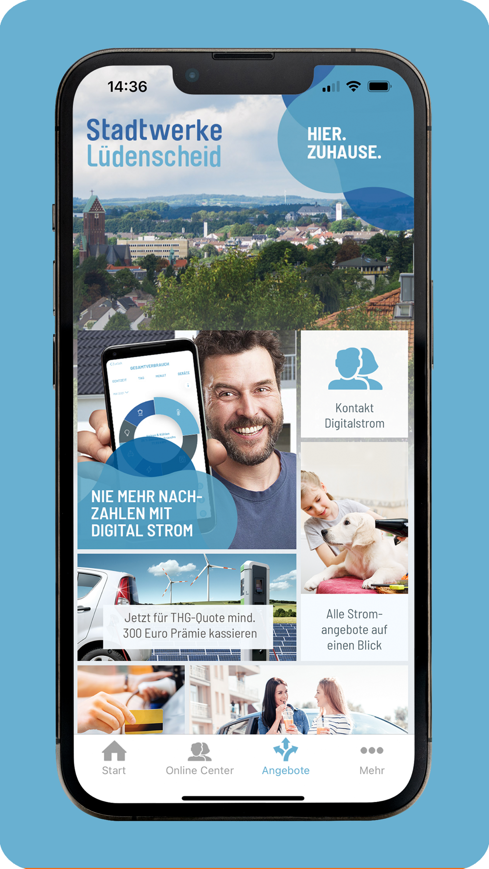 Ob Zuhause oder unterwegs: Mit der kostenlosen App der Stadtwerke Lüdenscheid haben Sie Ihre Verträge zur Energie- und Wasserversorgung immer im Blick. Teilen Sie uns Ihre Zählerstände, Abschlagsänderungen, neue Telefonnummern oder Bankdaten einfach, sicher und schnell mit. Profitieren Sie auch von News und Angeboten Ihrer Stadtwerke Lüdenscheid.