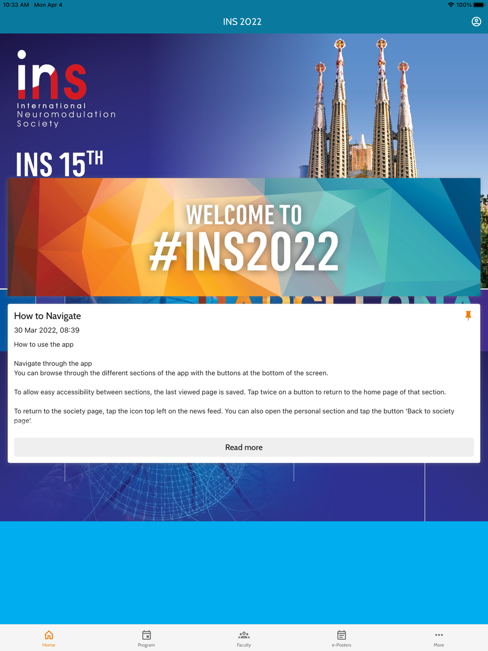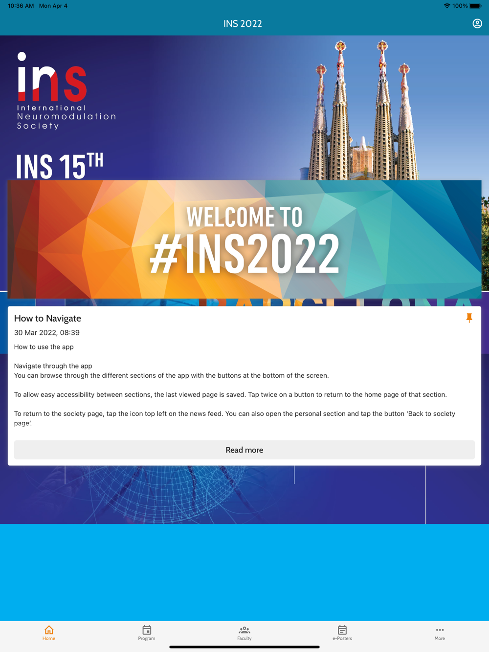 The mobile app is your full-featured guide to manage your congress attendance during the 15th World Congress of the International Neuromodulation Society - INS, which will be held in Barcelona, May 21-26, 2022.