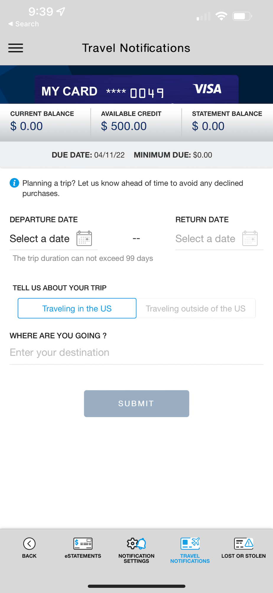 • Set travel notifications.