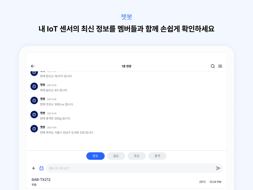 챗봇 기능을 이용해서 내 IoT 센서의 최신 정보를 멤버들과 함께 손쉽게 확인할 수 있습니다.