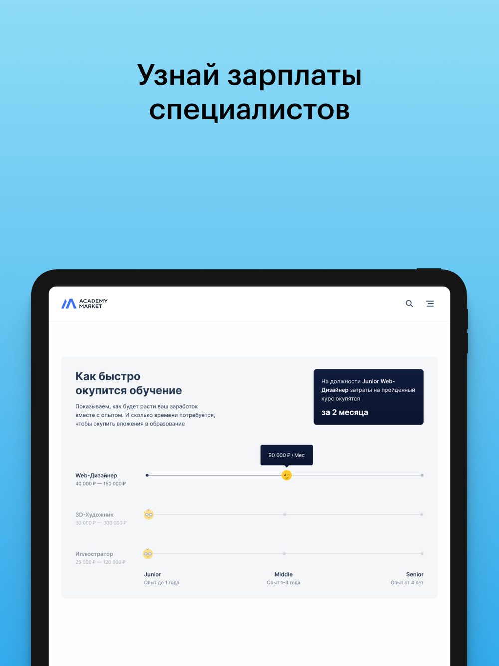 Мы с радостью поможем вам сориентироваться в последних тенденциях на рынке труда и расскажем все о самых востребованных профессиях мира. Прямо на странице интересующего вас курса вы увидите, какие зарплаты получают специалисты на разных должностях: от Junior до Team Lead.