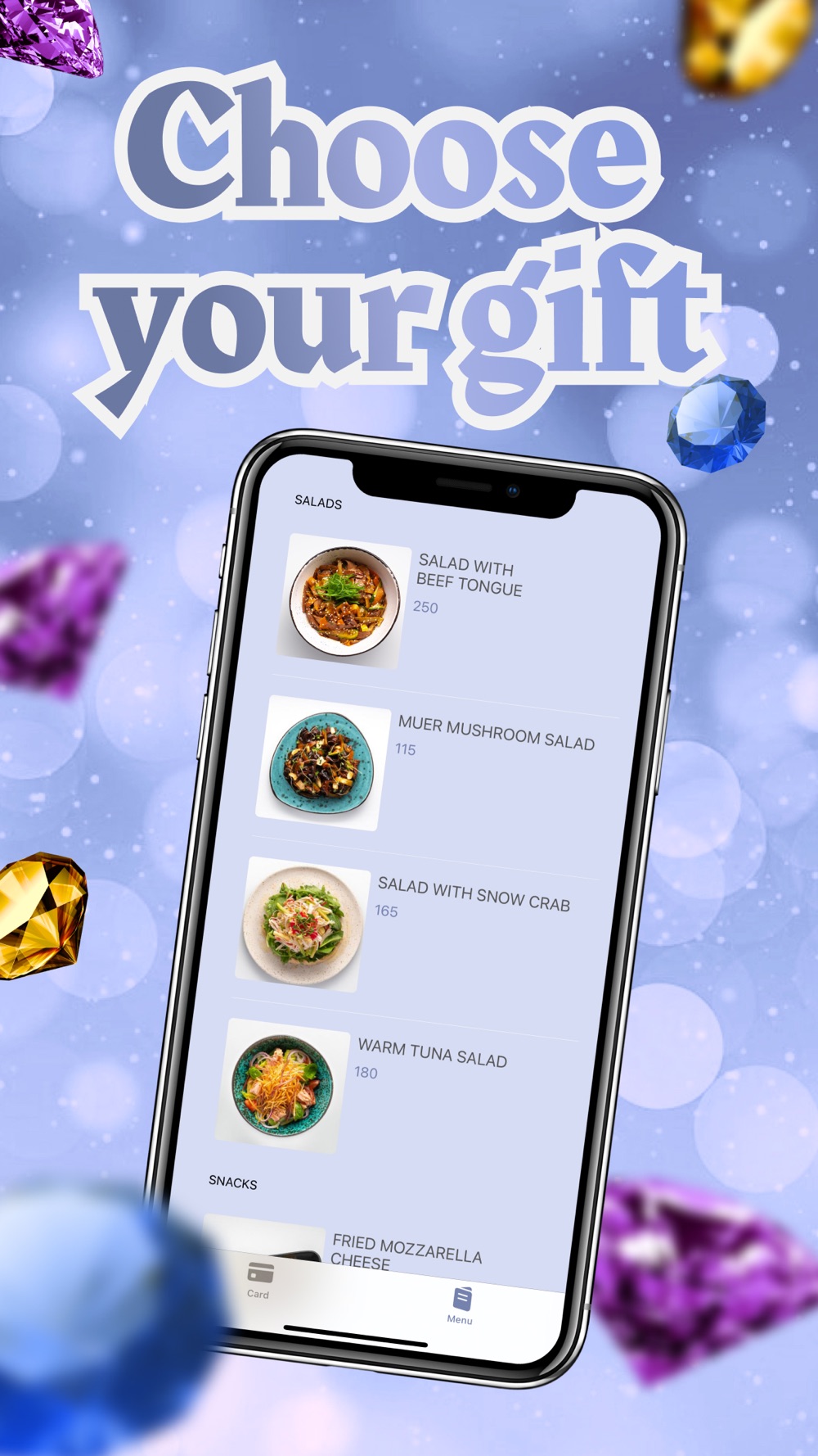 With the help of our loyalty application, you will receive a personal bonus card, on which, when you pay an invoice in our establishment, you will receive bonus points that you can exchange for gifts from our menu.