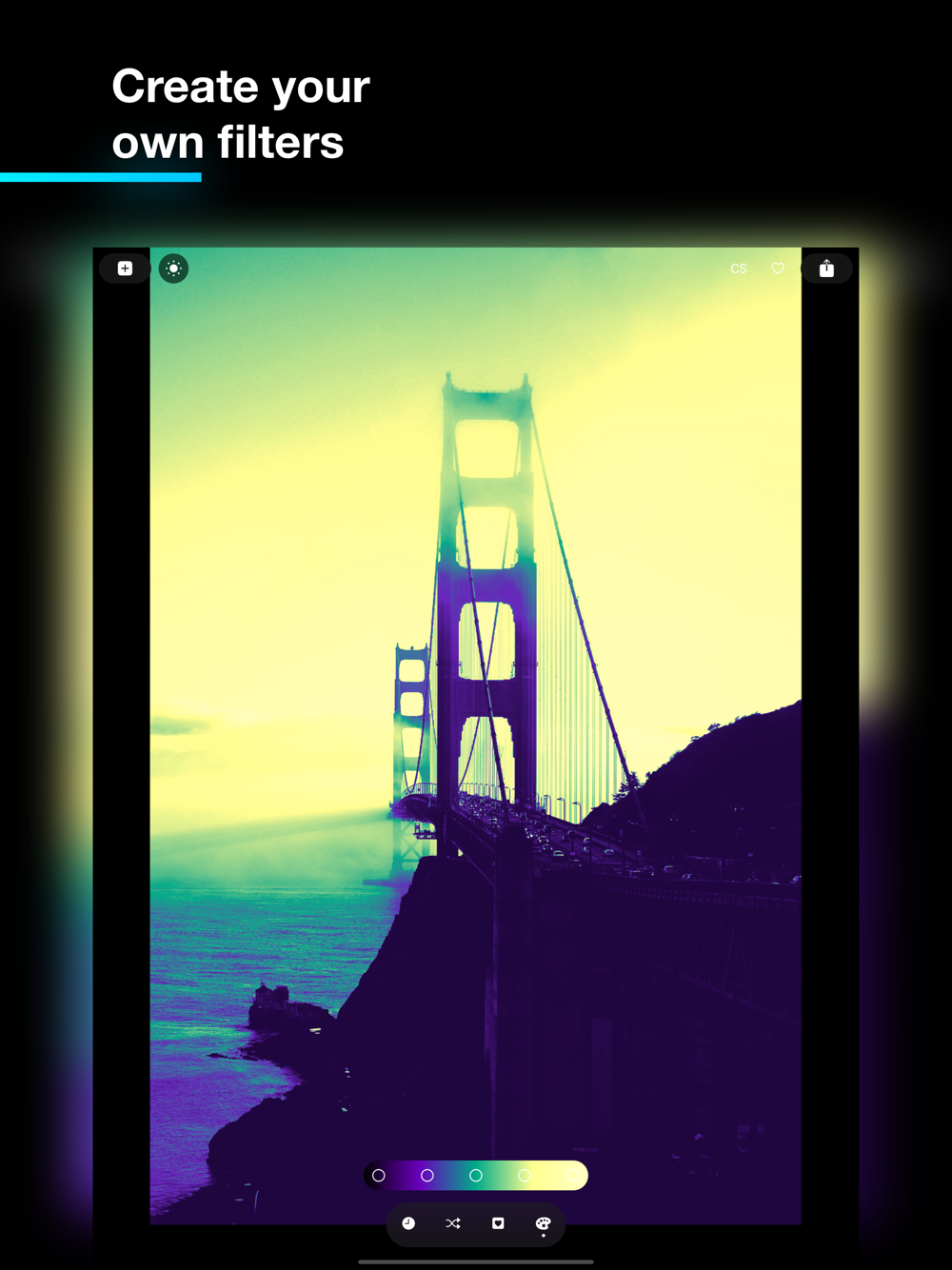 Create your own unique style. Extensive settings allow you to create personalized filters and remember your own collection, adding custom filters to your favorites to use your original colors in any other project. Imagine using sunglasses, become a master of customization, creating unusual dark filters, set any colors, without restrictions. Use the built-in effects, glow - blurs the bright elements in the image to get a fade, like a film camera. Pixelation, movement in a photo or zoom, to give the effect of speed.