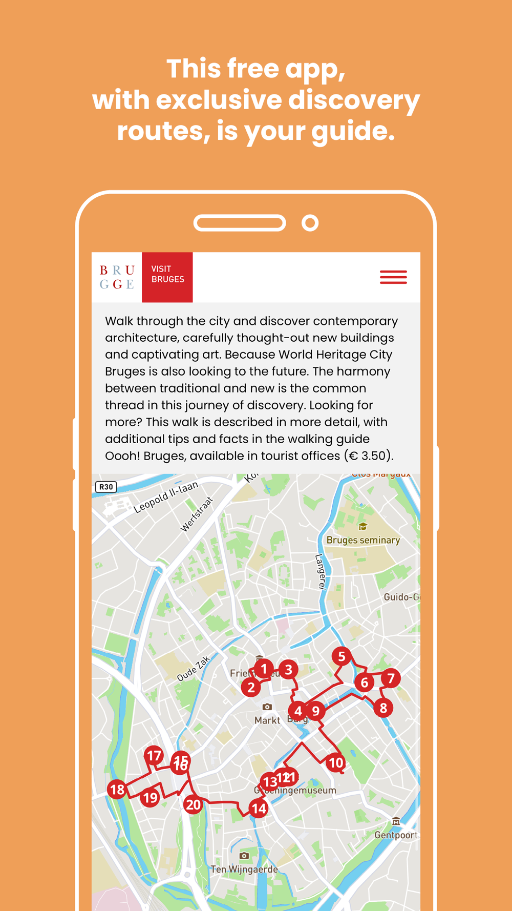 This app, with exclusive discovery routes, is your guide. Free, easy to use and full of surprising information, photos and interactive content. Bruges always close by.