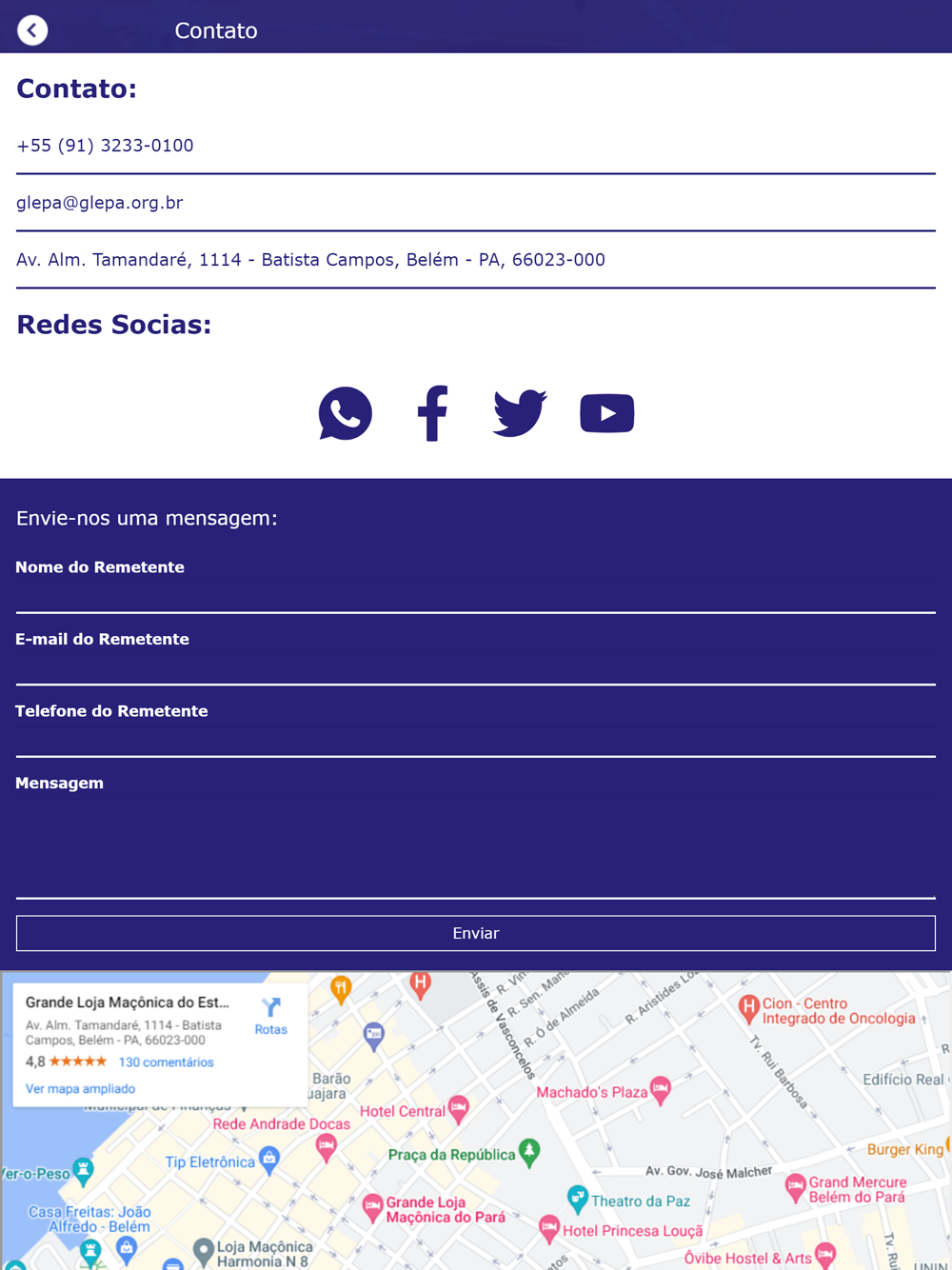 9) Através do menu "Contato" o usuário tem acesso à informações de contato da "GLEPA".