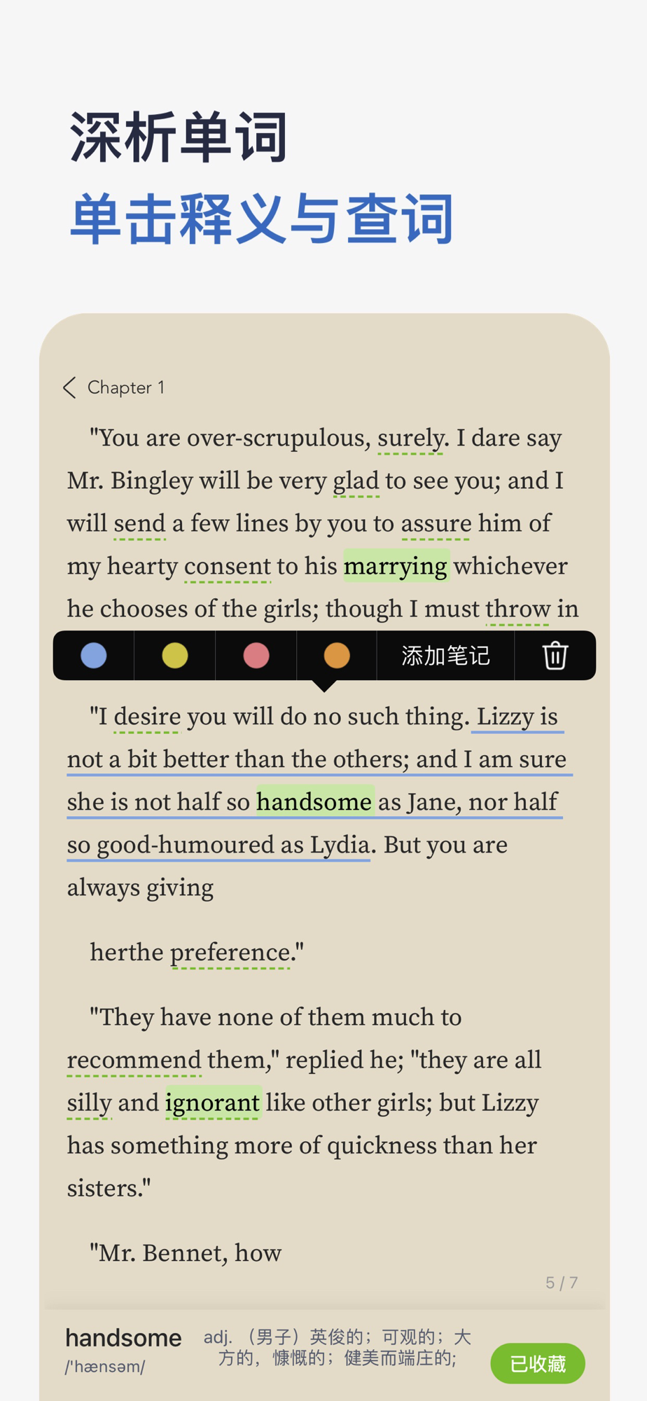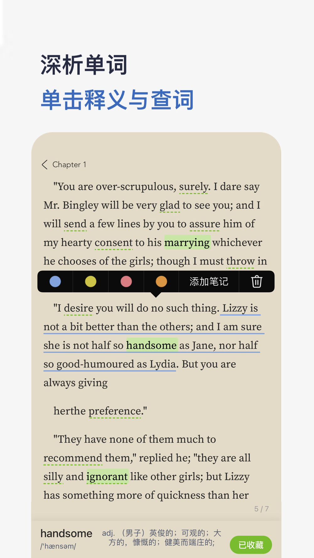 • 单词高亮,会根据学习的不同等级,高亮词汇,在阅读中记忆