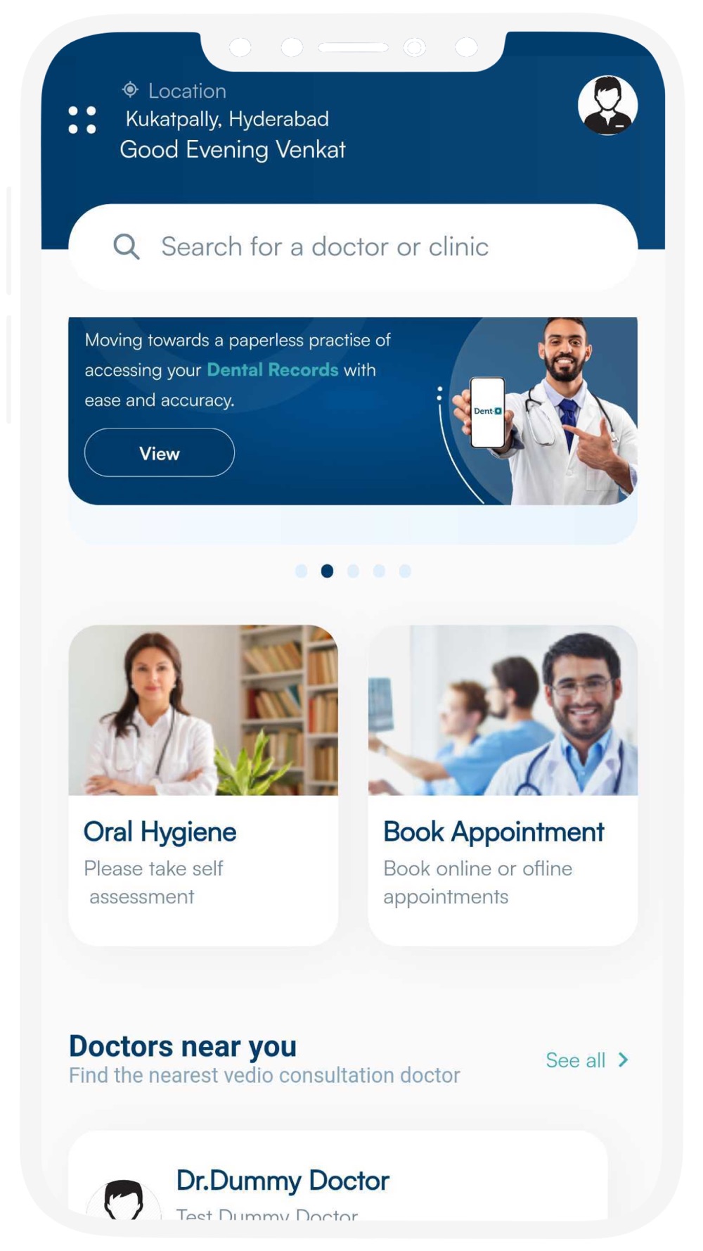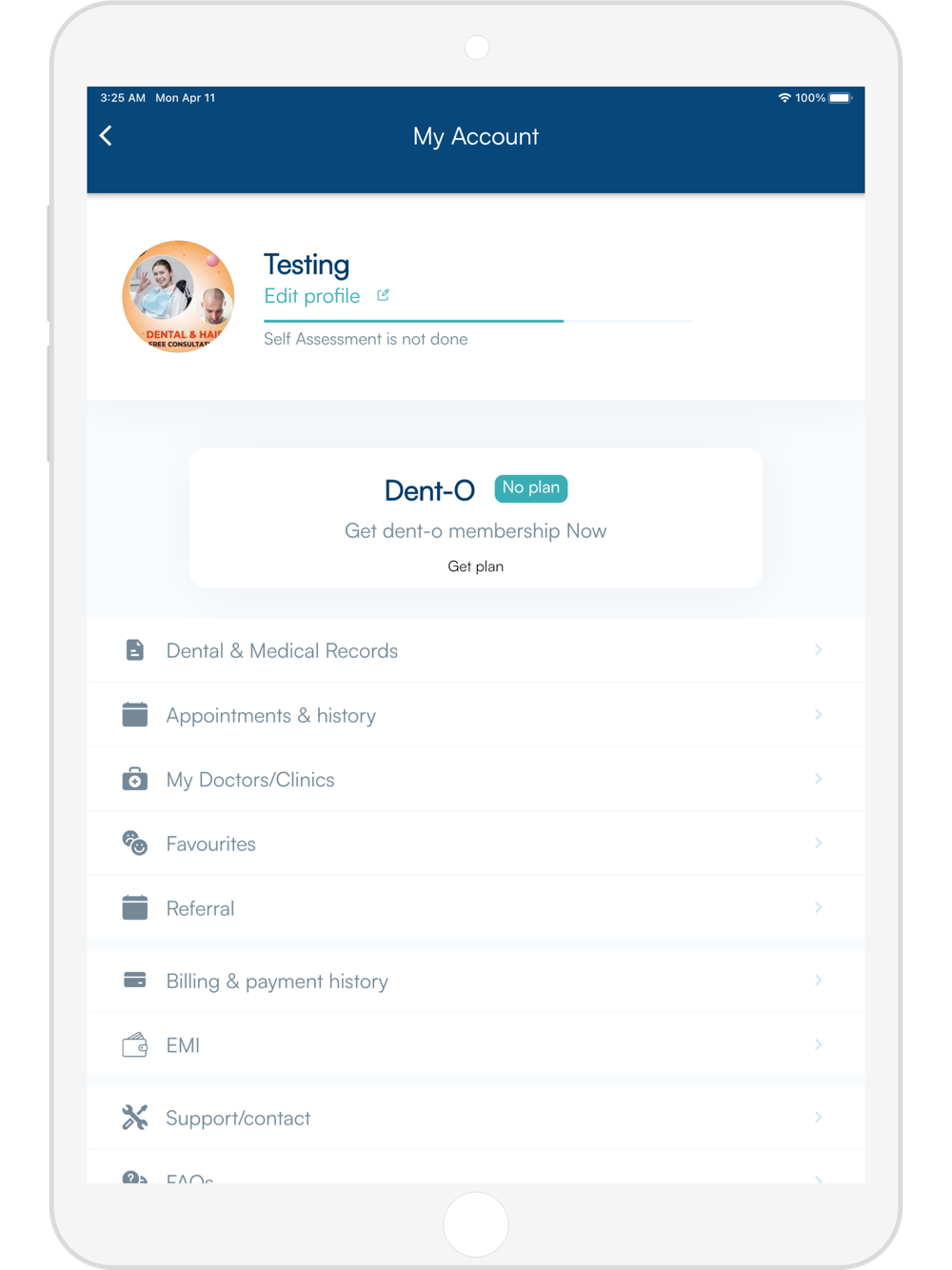 We at Dent-O provide complete solution to dental needs which include conducting free dental campaigns, guidance to your nearby clinics, electronic dental records at your fingertips, clinic management and so on and so forth. We offer various services like Dental health tracking, Clinic management, E-Dental records, Self Assessment etc.