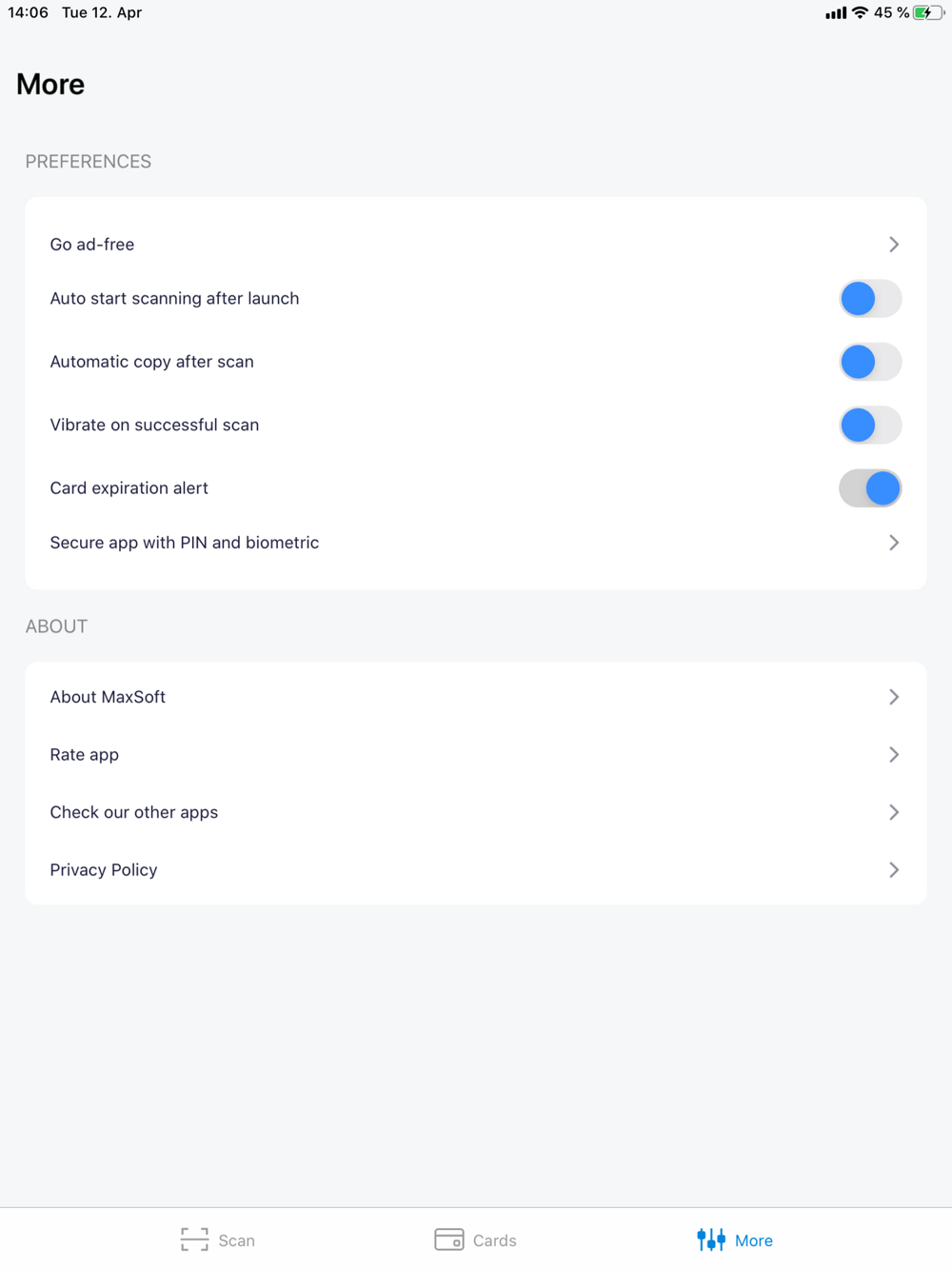 Credit Card Reader and Wallet application is is designed to support and read all types of credit and debit cards. You can use it to easily copy your card data to other applications or websites when you need that.