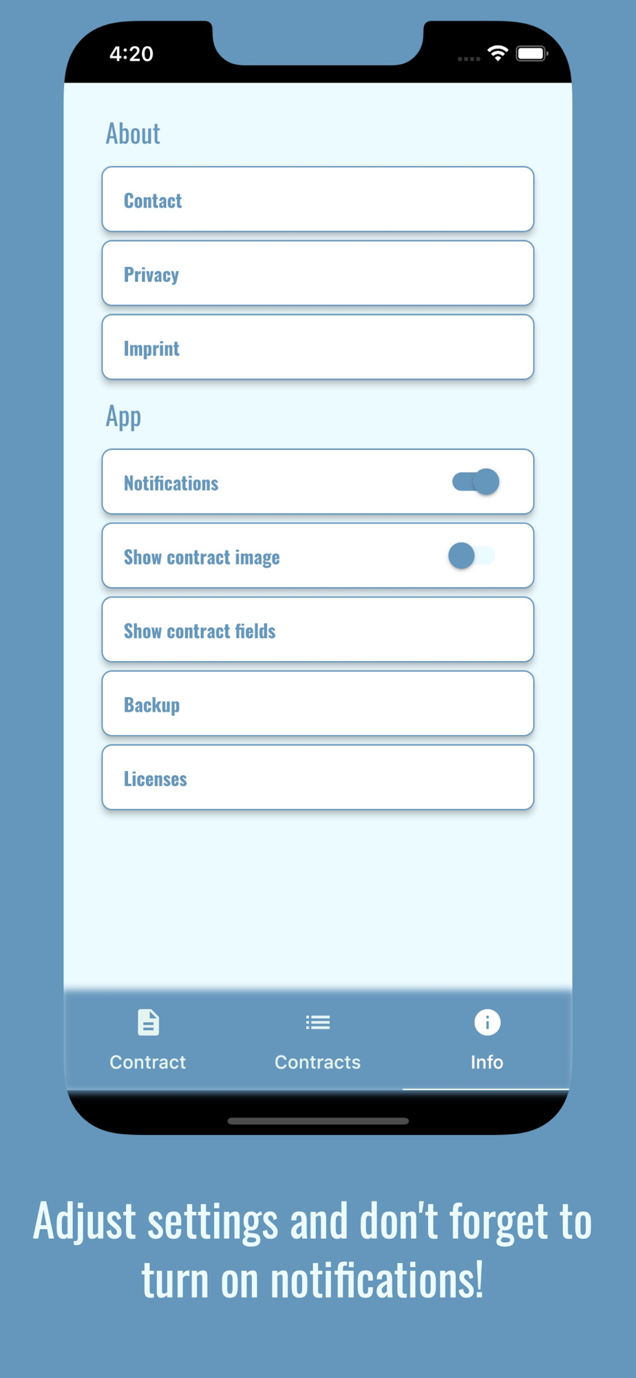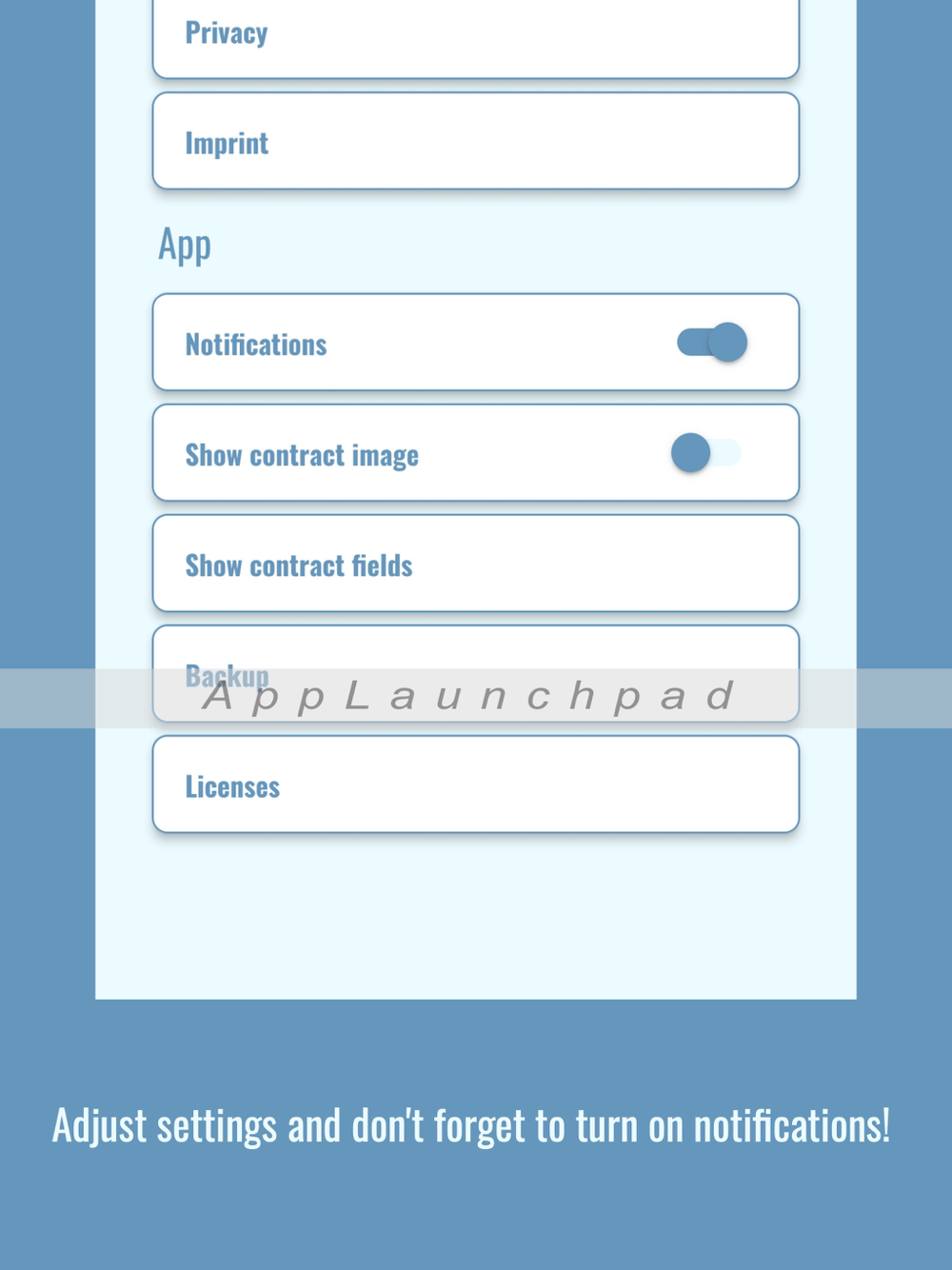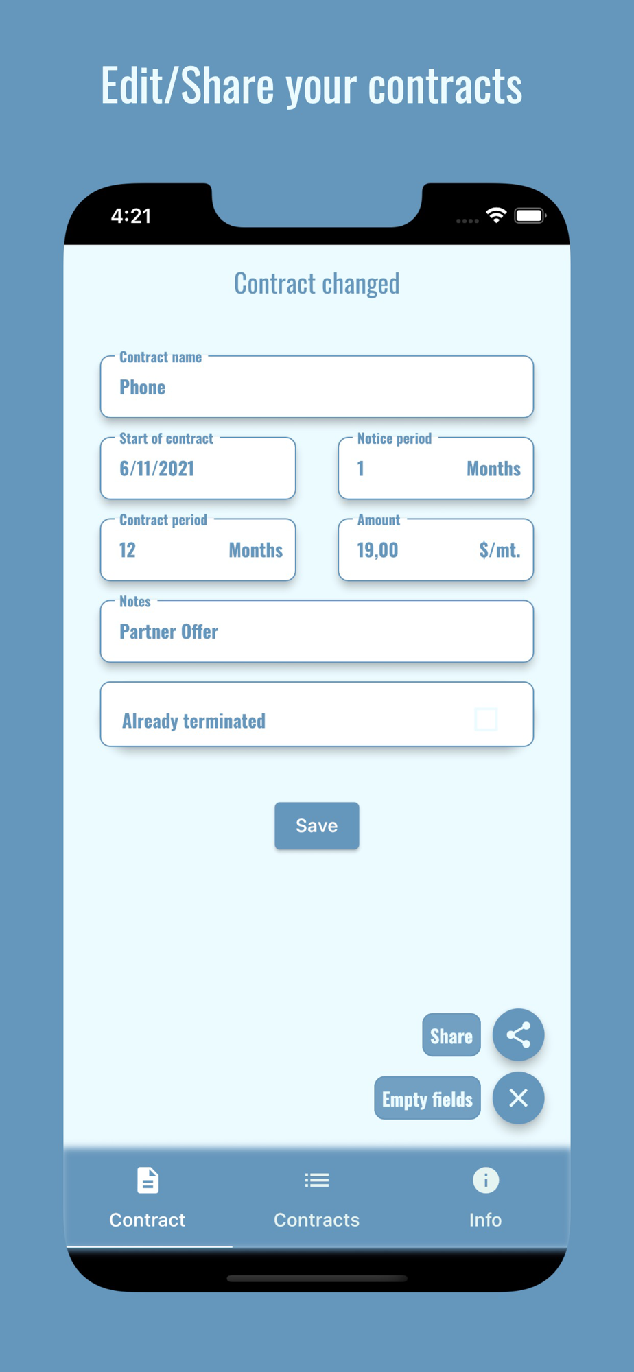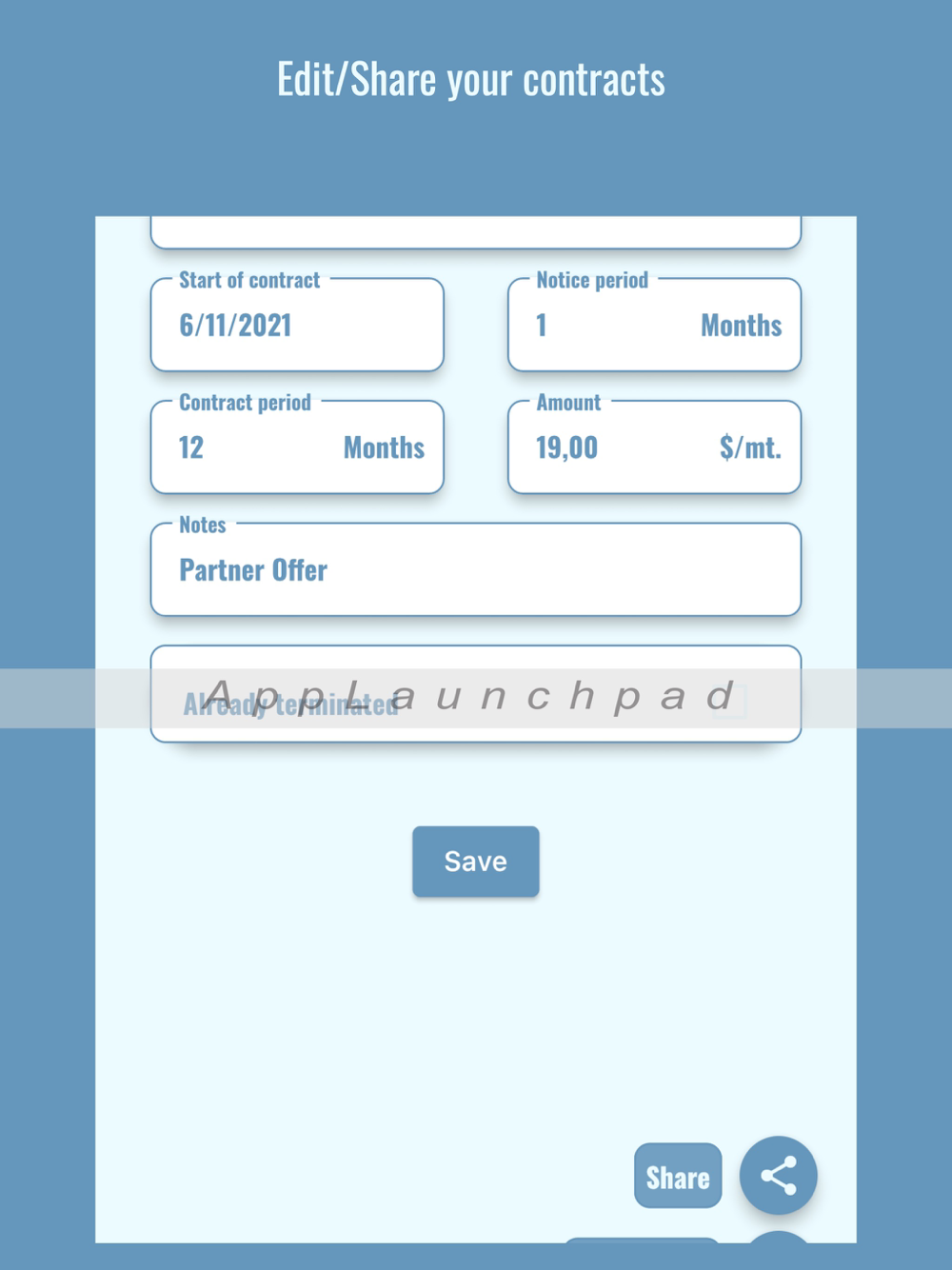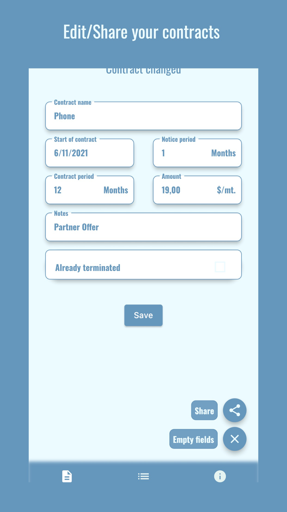 For each contract, you can optionally enter additional data (such as data on the contract partner and details of the contract), as well as a picture of the contract. All this data is saved locally only and will not be reused or shared!
