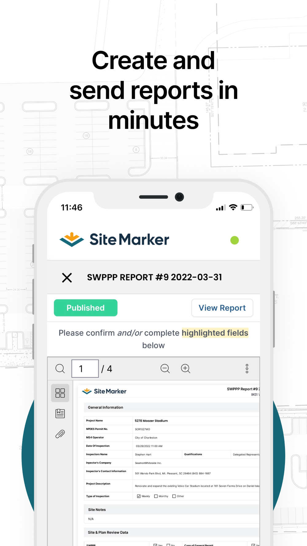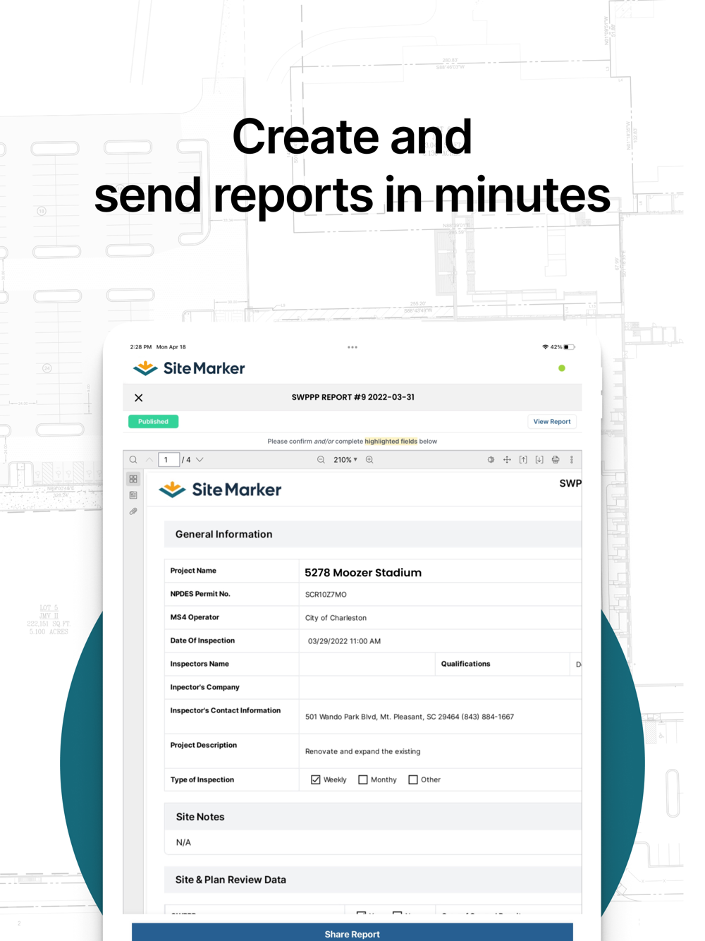 Site Marker is a next generation site data collection and reporting platform that enables your team to document data on-site with a mobile device, create reports in minutes and collaborate with stakeholders in real time. Forget notepads, construction drawings and hand-typed reports. Everything arrives on-site with you in the Site Marker mobile app.