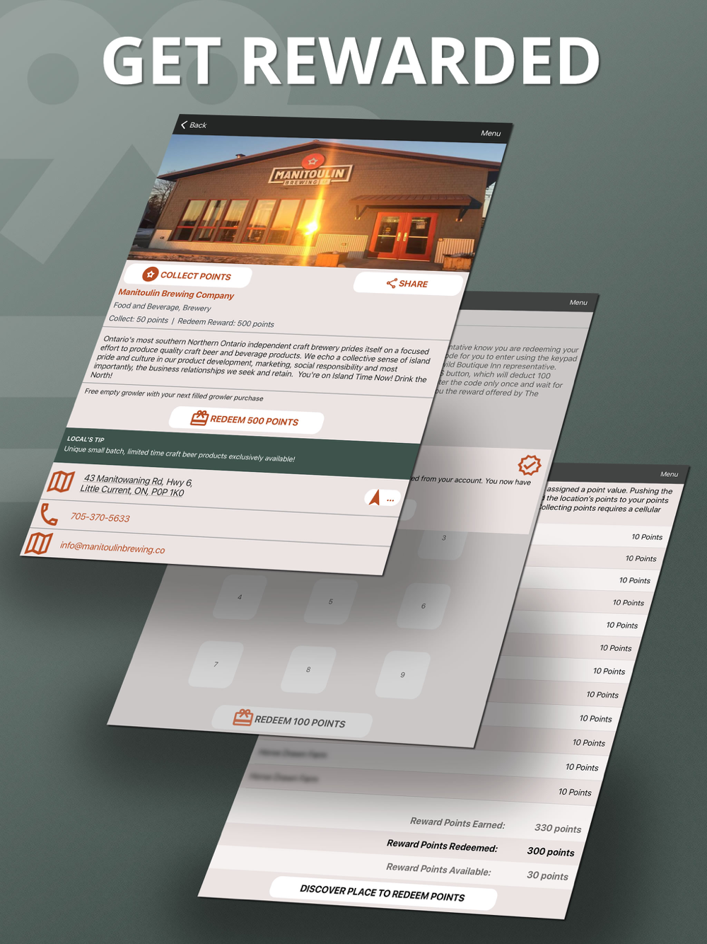 Once you collect enough points, those points can be redeemed for goods or services at Manitoulin Adventure Map Rewards locations, which are indicated in the app. Select the place where you would like to redeem your reward. Hitting the “Redeem Rewards” button while physically at a Rewards location will bring up a key pad for the place owner to enter a code to deduct points from your point total in exchange for your reward. You must have an internet connection in order to redeem points.