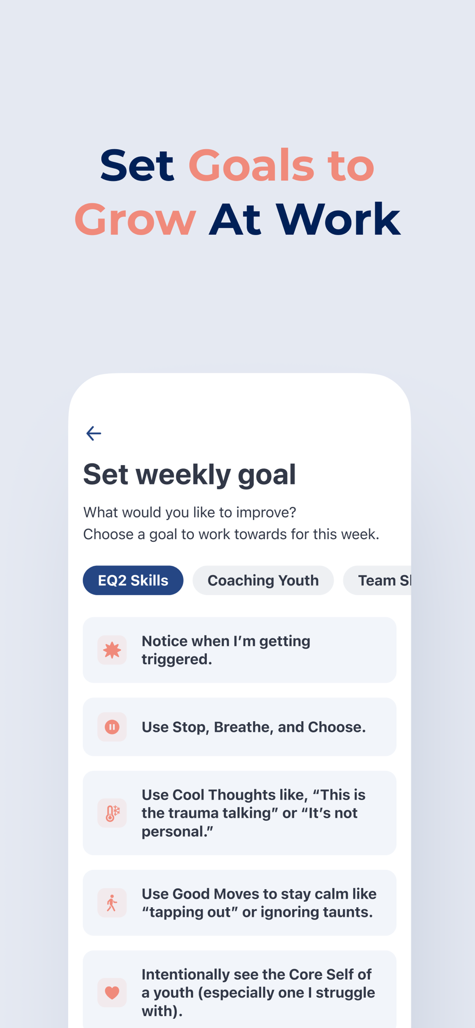 The app includes a daily emotional check-in to increase staff awareness of their mood and stress level. Based on the valence of the user's response, the app sends curated responses with the goal of helping staff become calmer and more regulated prior to engaging with youth. The daily check-in feature also reinforces the understanding that emotions are contagious and how staff emotionally "show up" impacts their fellow staff, the youth they serve, and the larger emotional climate of the agency. The app also allows staff to select weekly work-related goals from a list of research-based behaviors shown to support the social and emotional well-being of trauma-impacted youth. Once a staff selects a goal, a list of tips, strategies and learning resources is generated to help staff achieve those goals. Goals are tracked over the course of the week and feedback is given based on user report of whether the goals were achieved. Users are also given the opportunity to set an "intention for the day." These intentions reflect qualities and characteristic linked to fostering positive relationships with youth. Users are then given a daily quote that reinforces key themes, concepts, and skills from the EQ2 program. These quotes, reflecting best practices in youth-centered care, are designed to support and motivate users prior to their shifts.