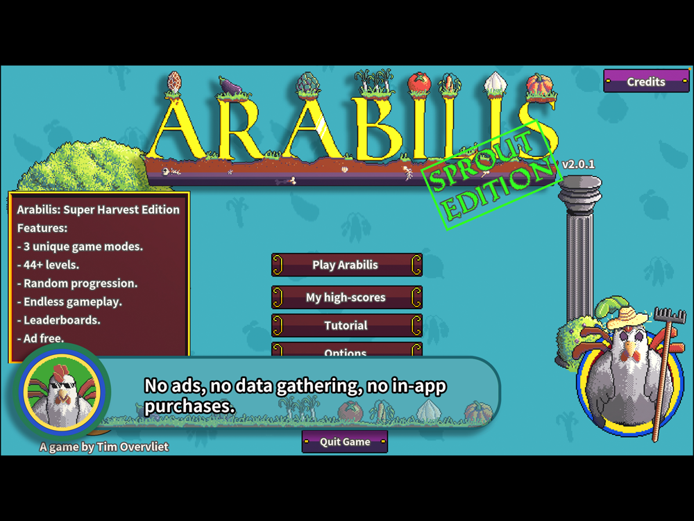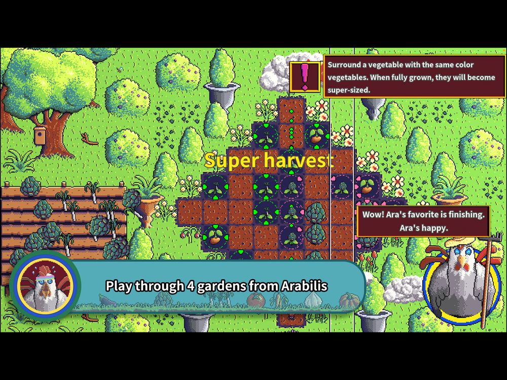 Arabilis: Sprout Edition is a free version of Arabilis: Super Harvest, which is a cozy arcade farming puzzle game. You are planting, growing and harvesting vegetables in gardens filled with randomized challenges.