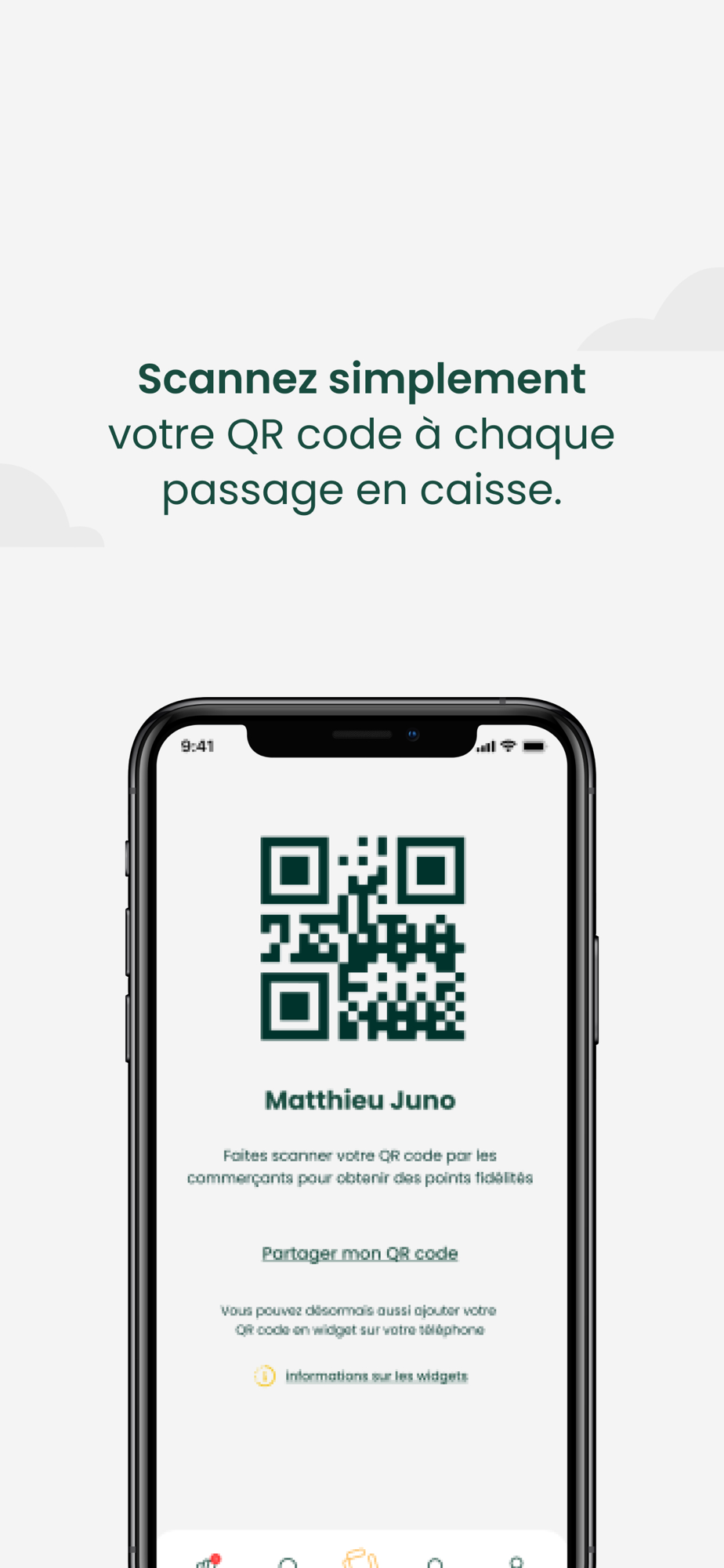 Create your profile in a few clicks and get a unique QR code to scan in your favorite local shops. In the same way as a stamped loyalty card, your merchant scans your QR code to award you points at each checkout to reward your loyalty.
