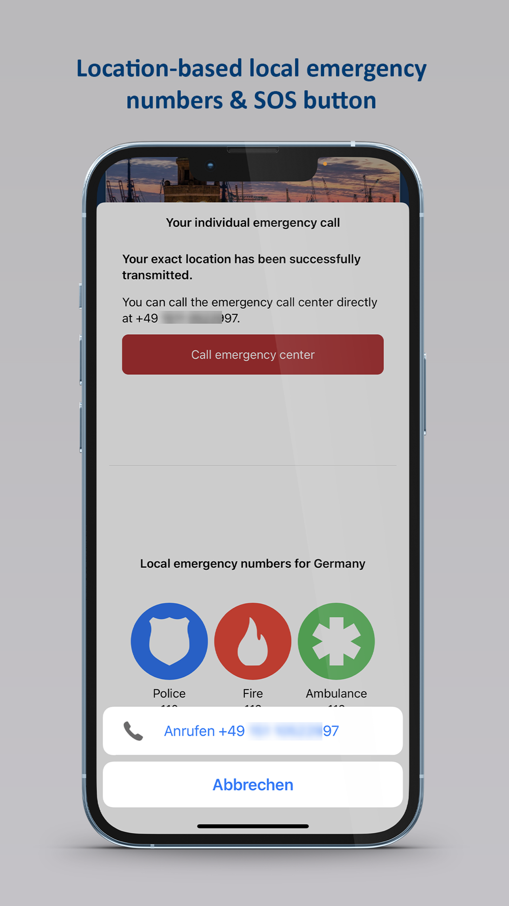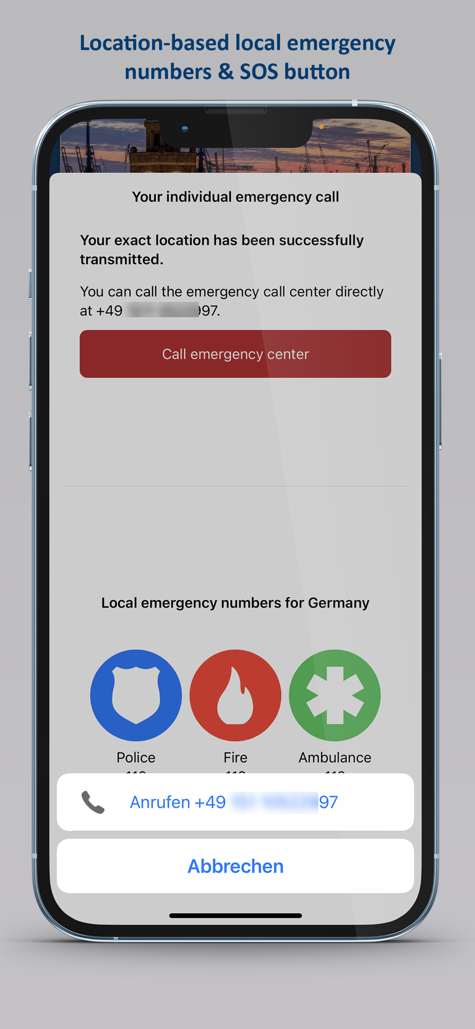 • Integration of the 24/7 medical and/or security emergency hotline (Assistance services required) and SOS button incl. location-based local emergency numbers