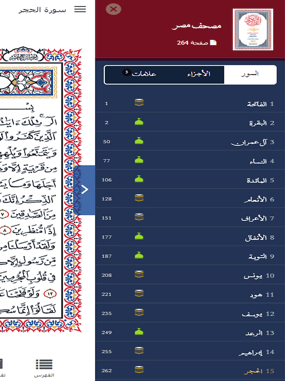وضع العلامات: قم بوضع إشارة مرجعية إلى السور أو الأيات التي تقرأها حاليا للعودة إليها بسهولة في وقت لاحق.