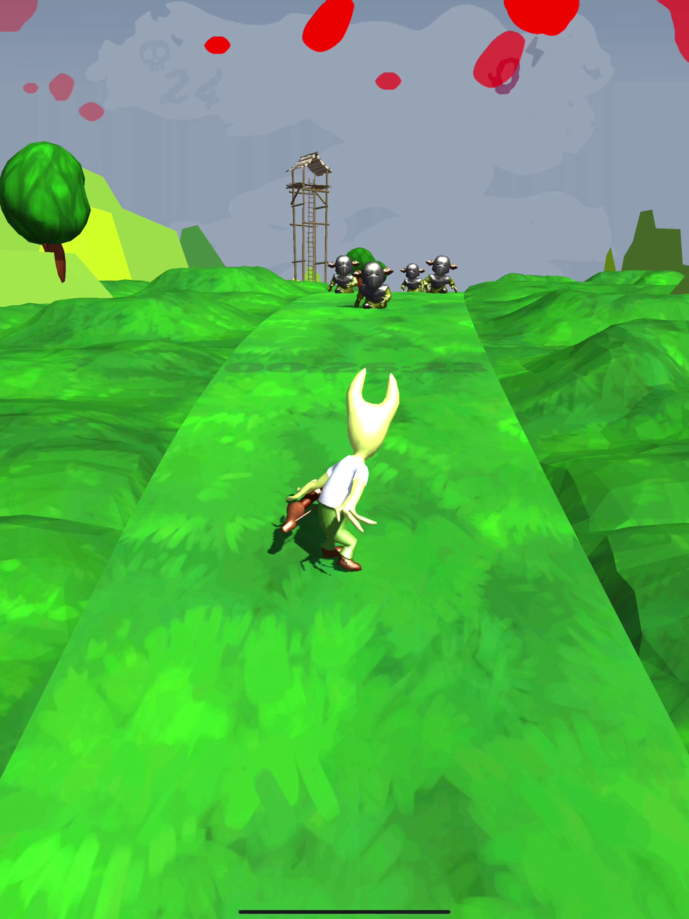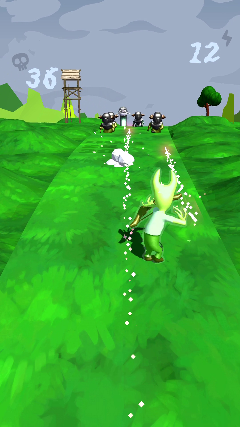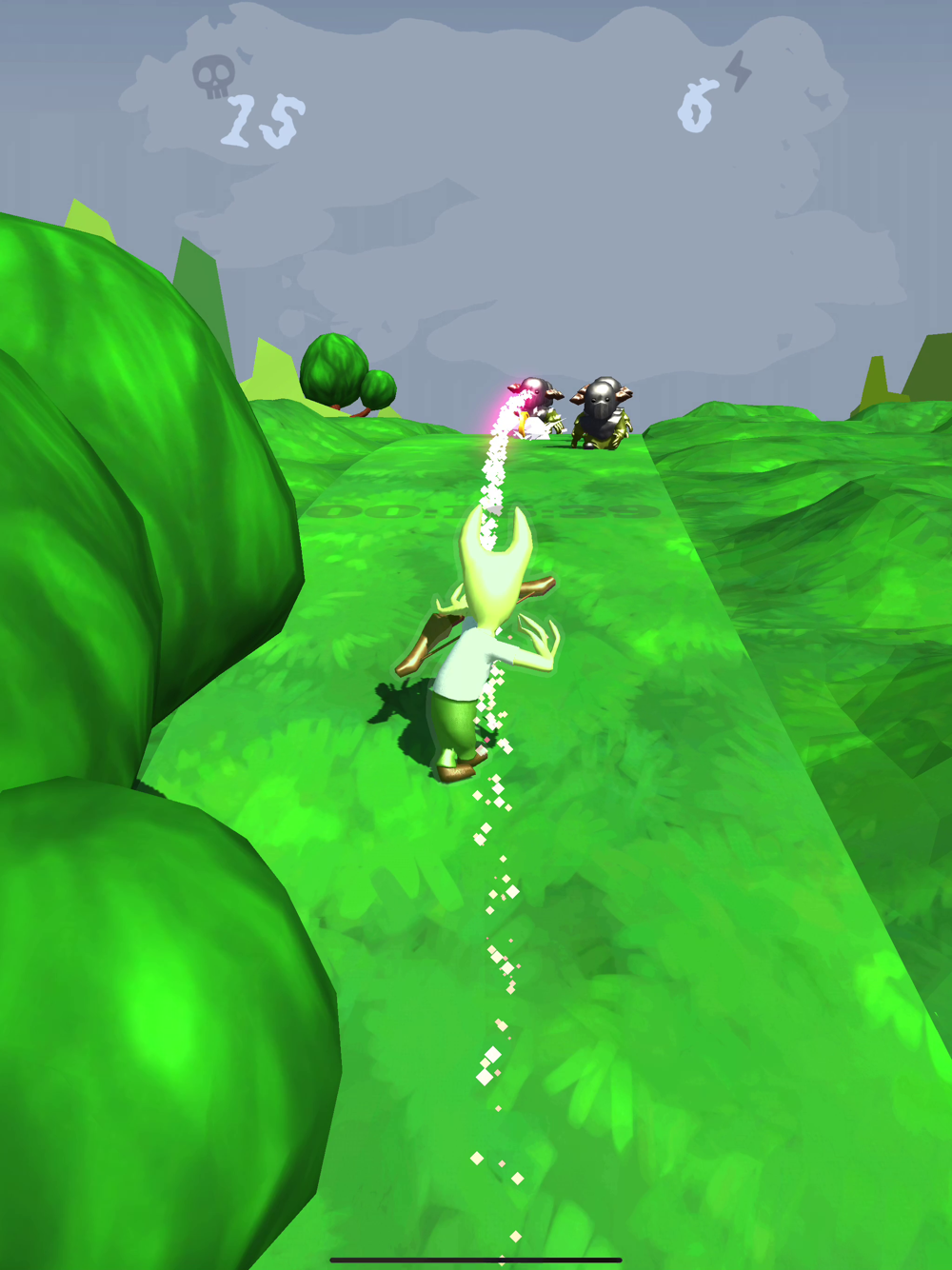 A runner game where avoiding obstacles maintains speed and health and stopping an oncoming enemy is rewarded with medals for level progression and coins to upgrade.
