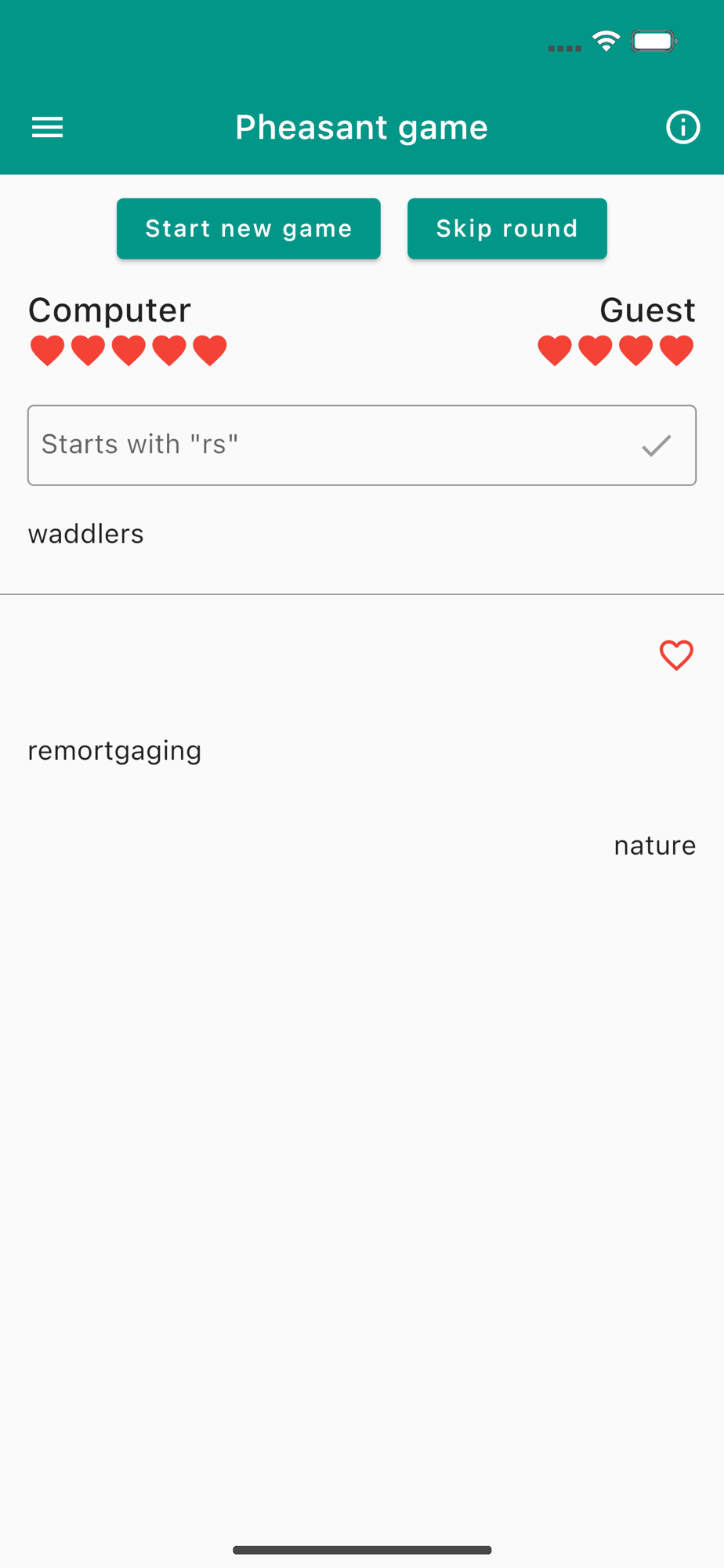 - Play Pheasant game (write the word that starts with the last 2 letters of the previous word);