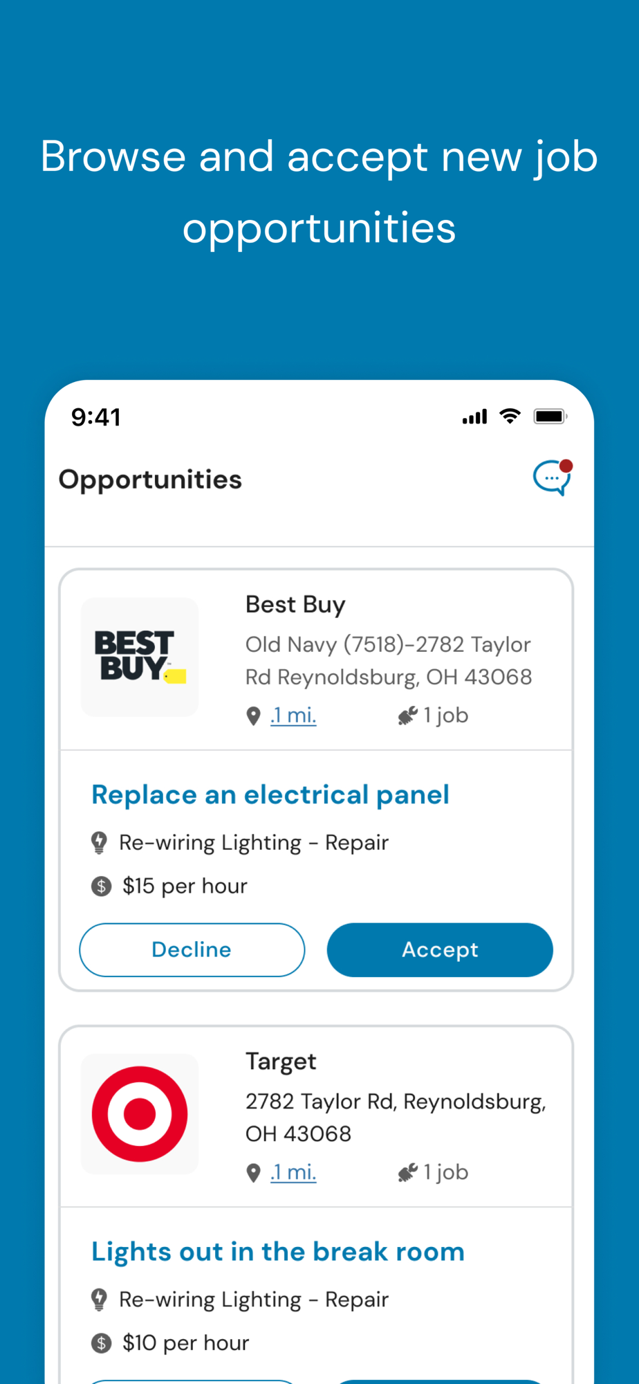 DMG Pro is designed and built specifically for technicians. You can create a custom profile and pick up jobs in any trade – handyman, electrical, landscaping, snow removal, plumbing, construction, lot sweeping and many more.