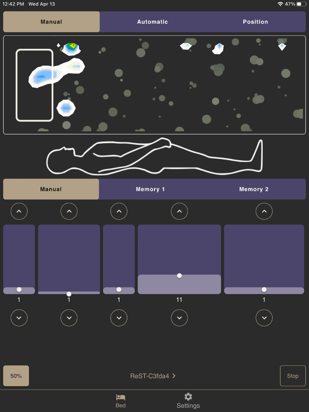 Automatic and Position mode utilize the smart sensor inside the mattress to detect real-time body pressure and triggers automatic and targeted firmness adjustments.