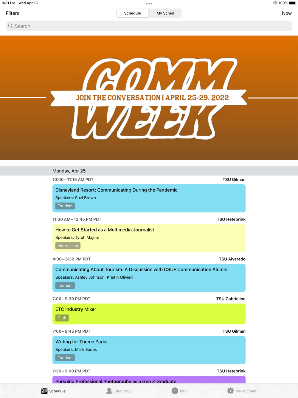 Conveniently browse the entire schedule for CSUF Comm Week 2022. Get the key information of your event without ever having to crack open an event guide.