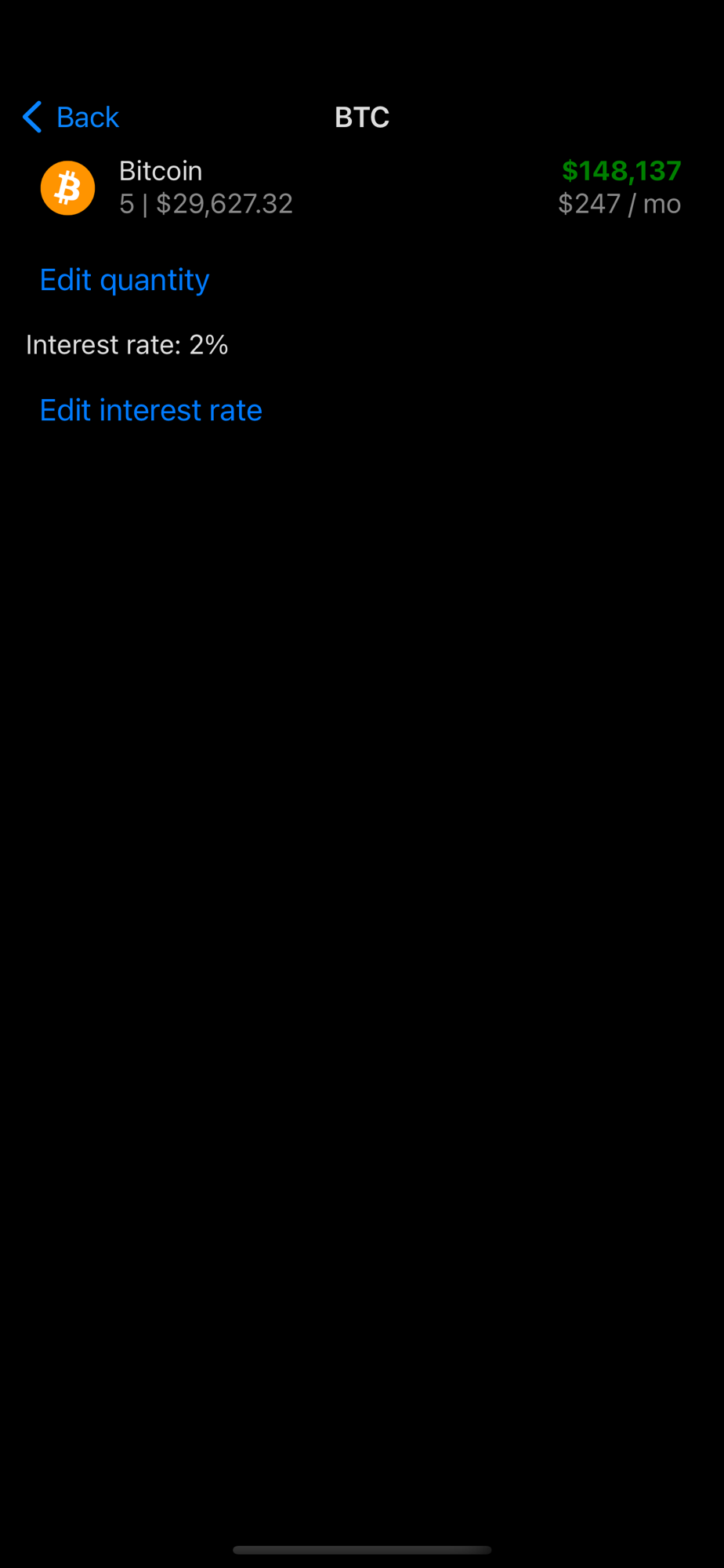 Quickly check the prices and total value of your cryptocurrency assets. Set a percentage they are earning in interest to quickly check your monthly income from cryptocurrency interest accounts. Use Dream mode in settings to apply a multiple to prices to see how your portfolio could grow or shrink.