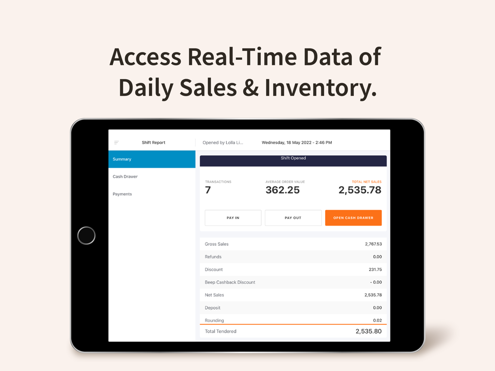 • Shift Report: Generate detailed shift reports that outline open and close times, total transactions, and total sales.