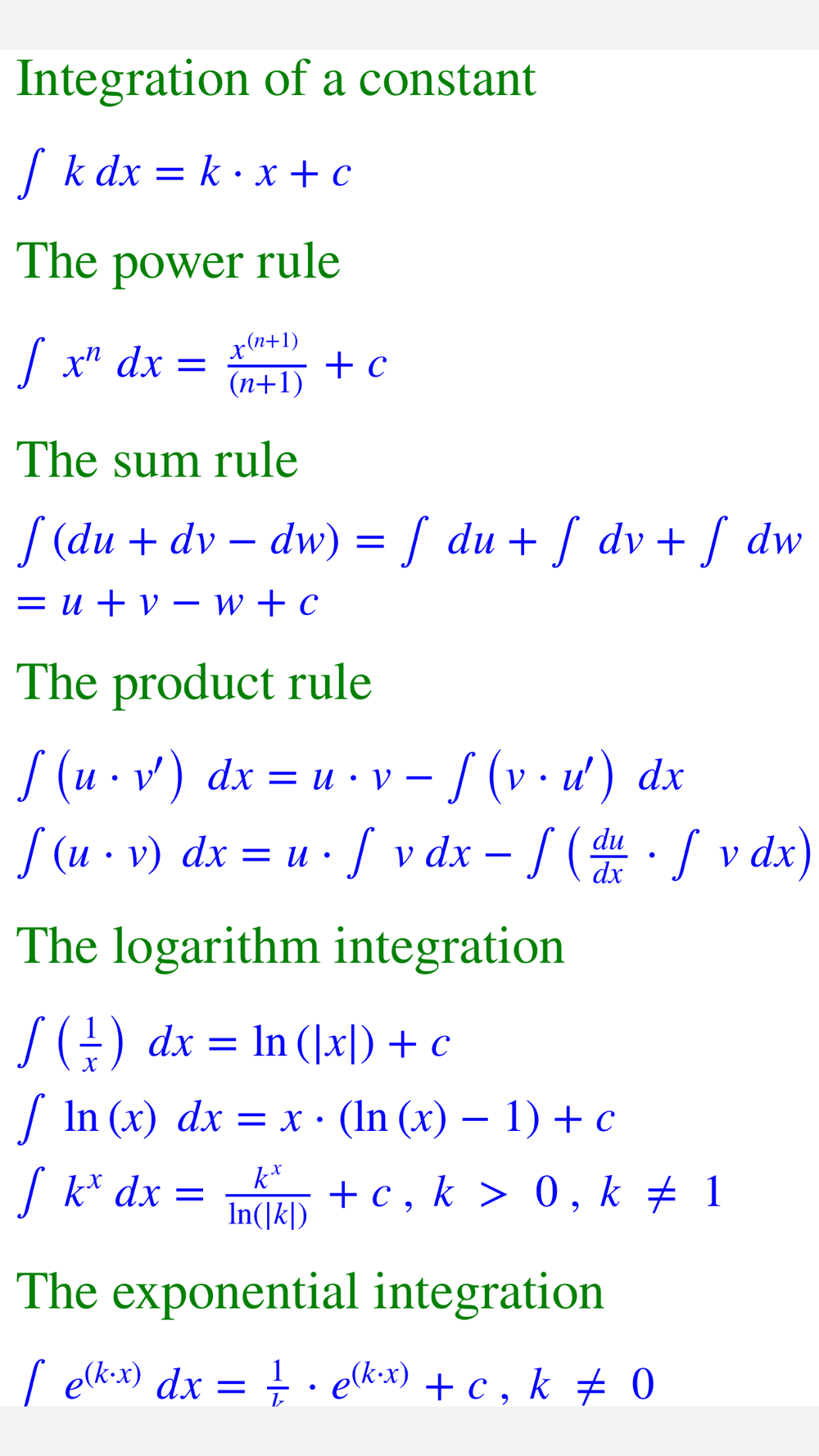 This app also has a Study page to help you learn important integration rules like, power rule, product rule, ect.