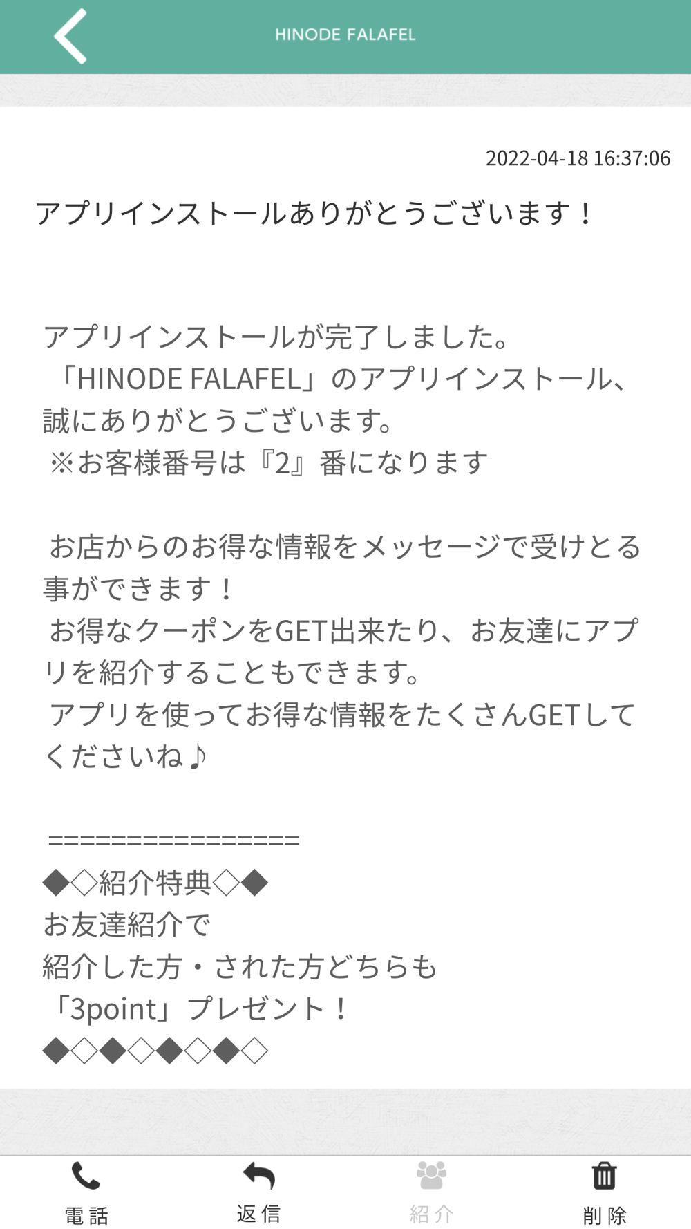 HINODE FALAFELのアプリをSNSを通じてお友達に紹介する事ができます。