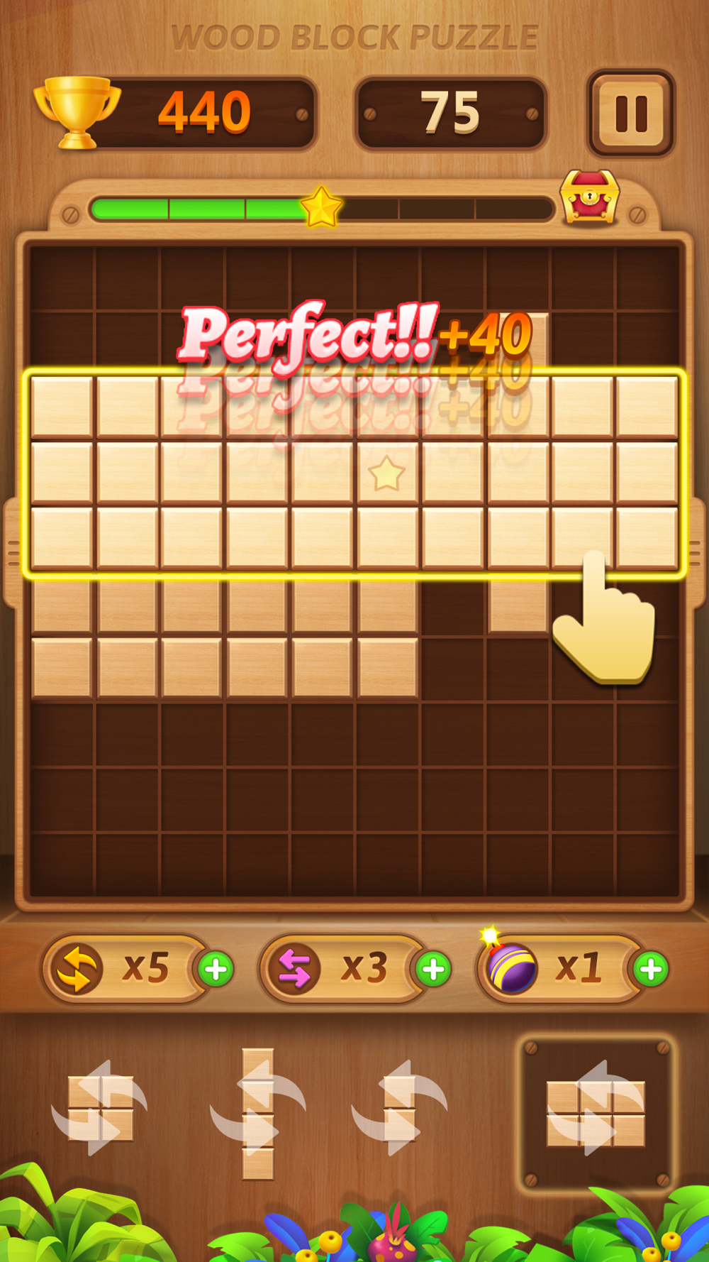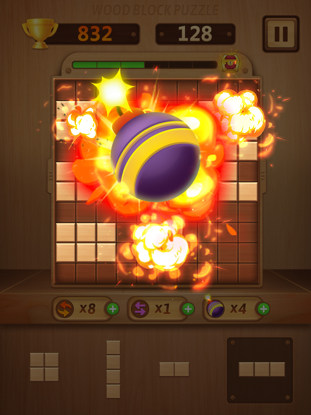 The goal of Wood Block Puzzle is to drop blocks in order to create and destroy full lines on the screen both vertically and horizontally. Don't forget to keep the blocks from filling the screen in this addictive puzzle game.