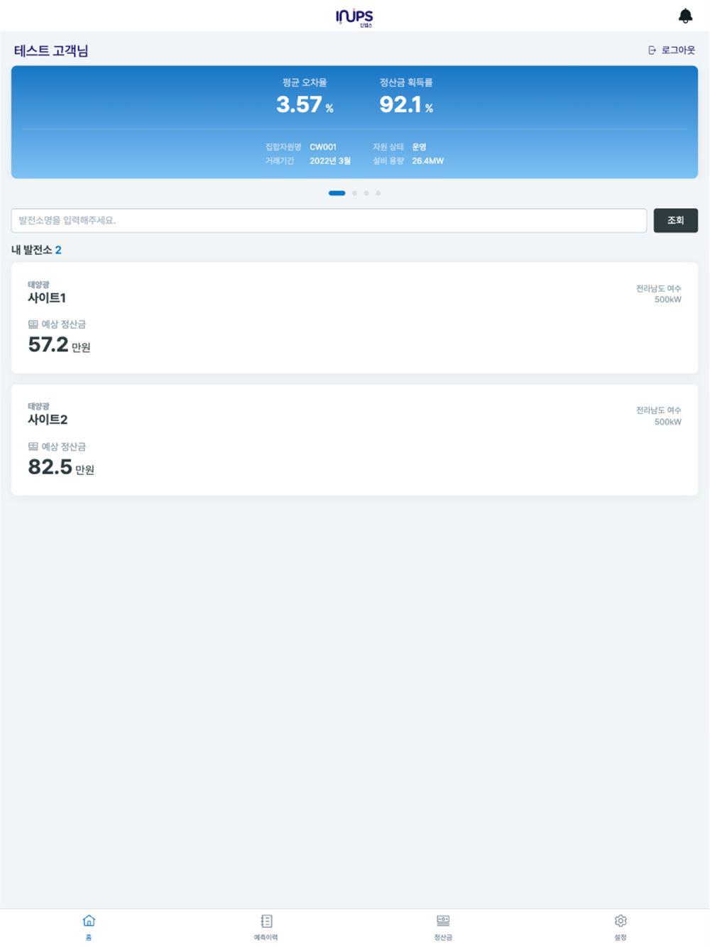 인업스 DERMS는 KPX 재생에너지 발전량 예측제도에 참여하는 신재생에너지 자원의 예측 발전량, 오차율 그리고 인센티브를 확인할 수 있습니다.