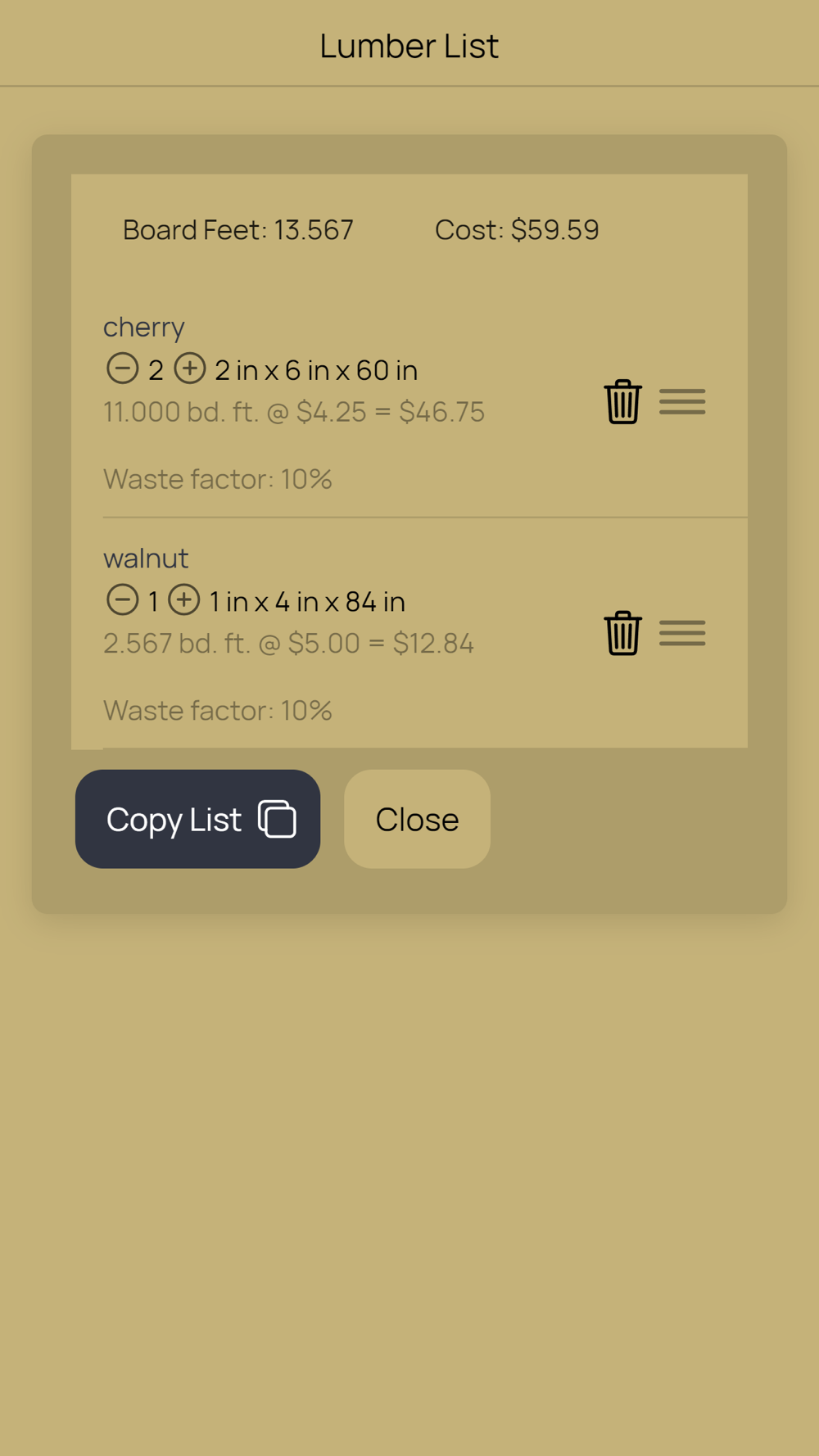 Optionally, you can enter a waste factor, species, quantity, and price.