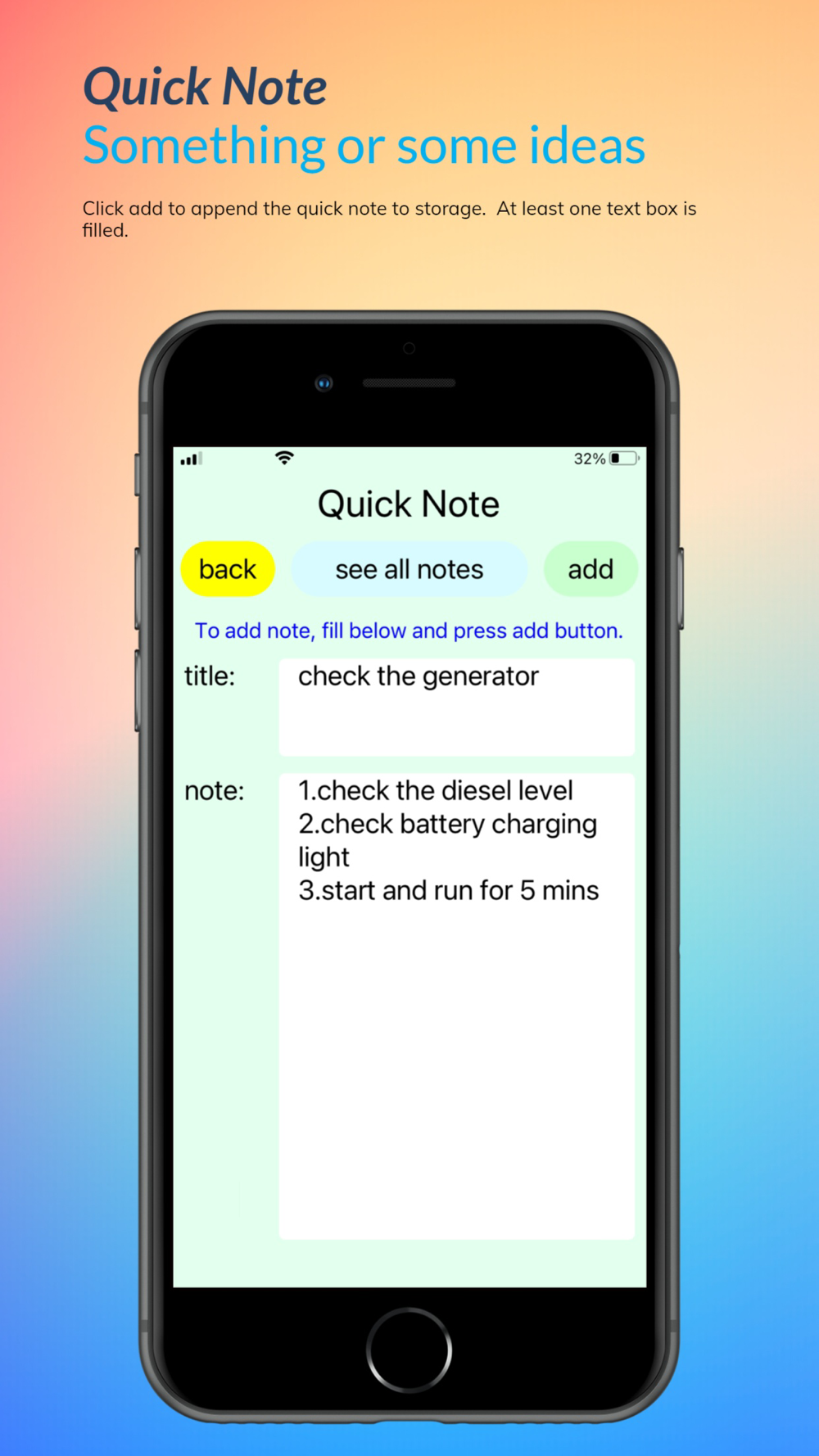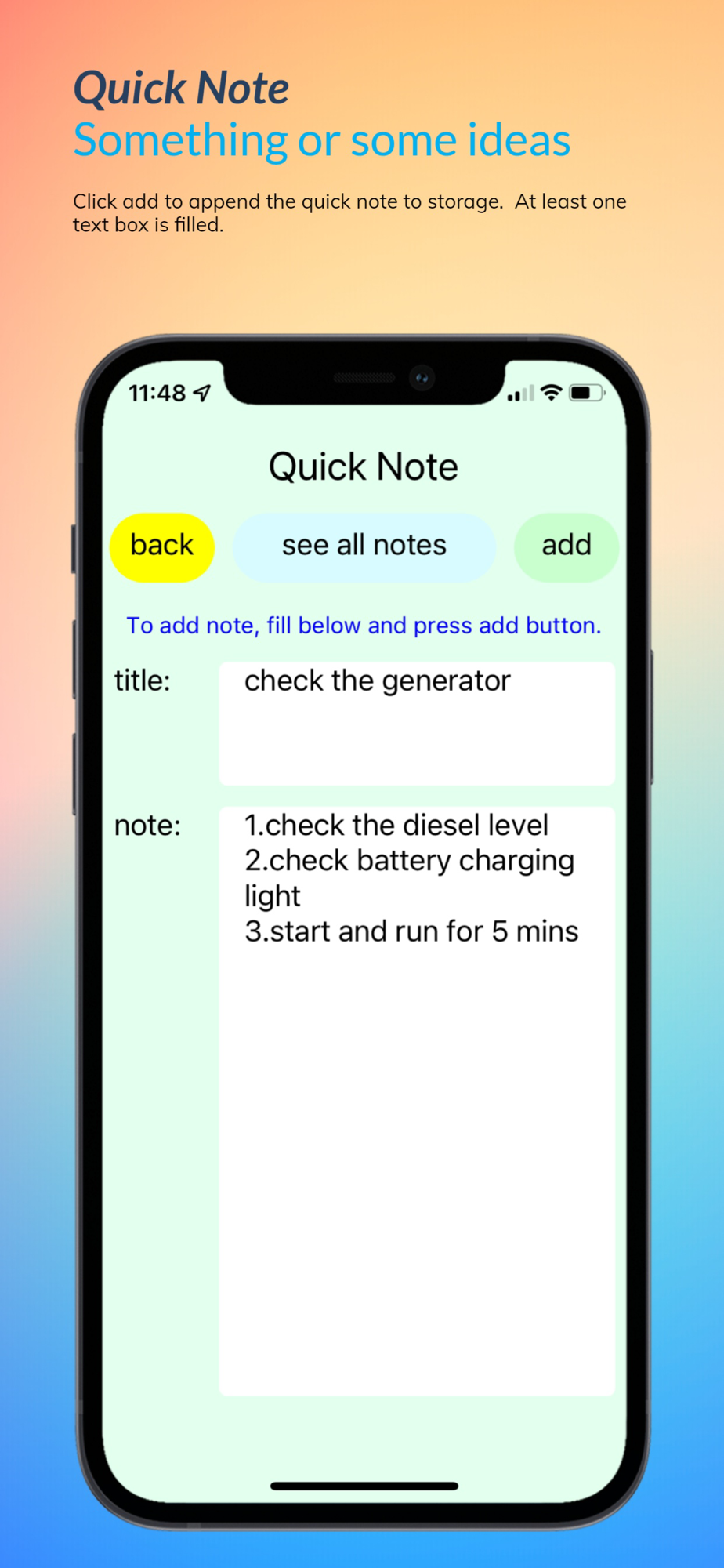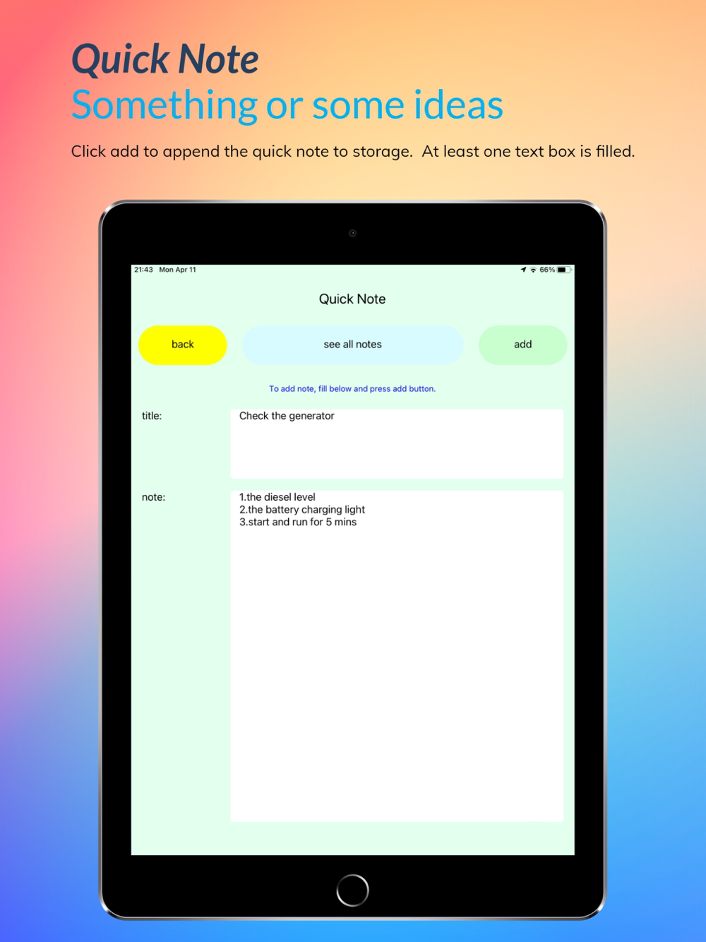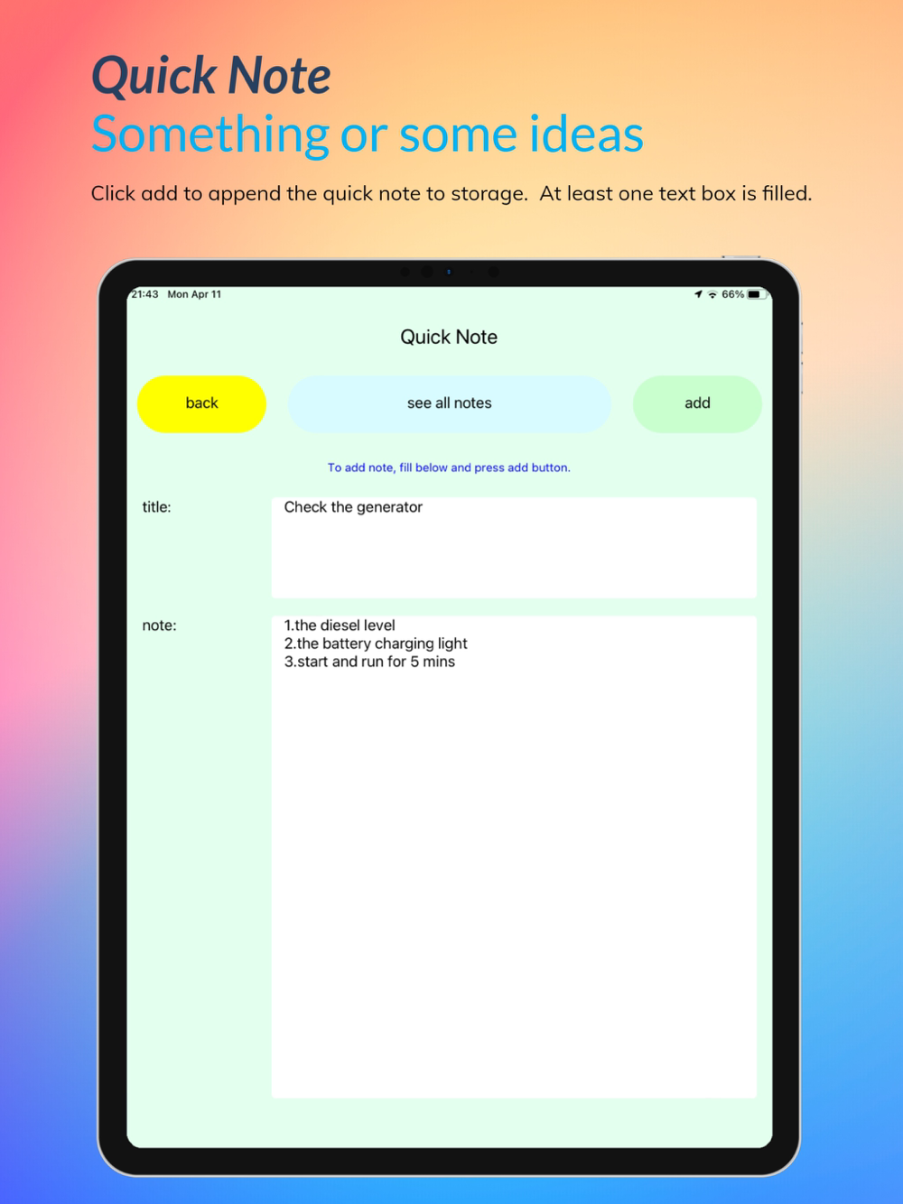 The entry page of Quick notes function is an editing page for user to add notes. There are 2 text boxes in the page. To save a note, at least one text box is filled. When “add” button is pressed, the app appends quick note to memory without screening. That is no key value is involved.