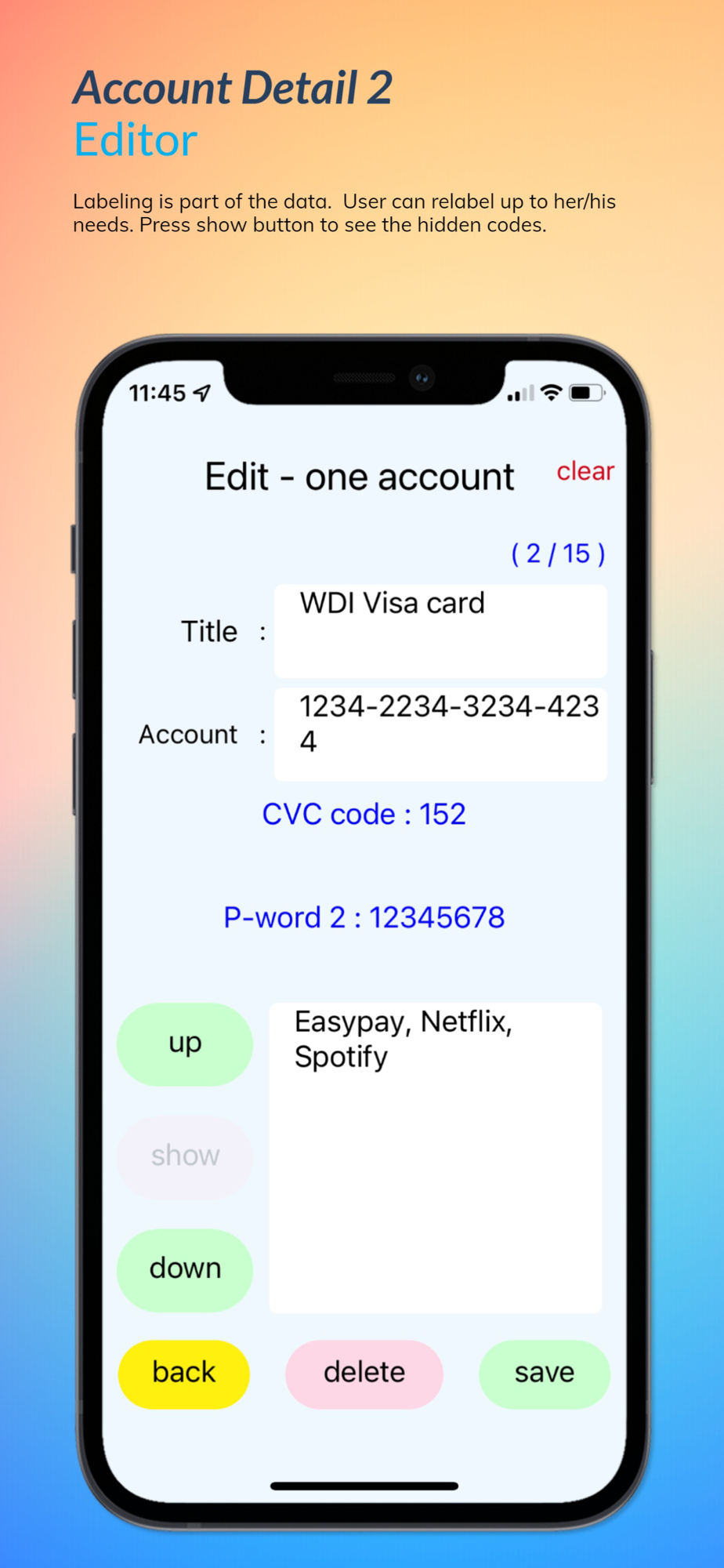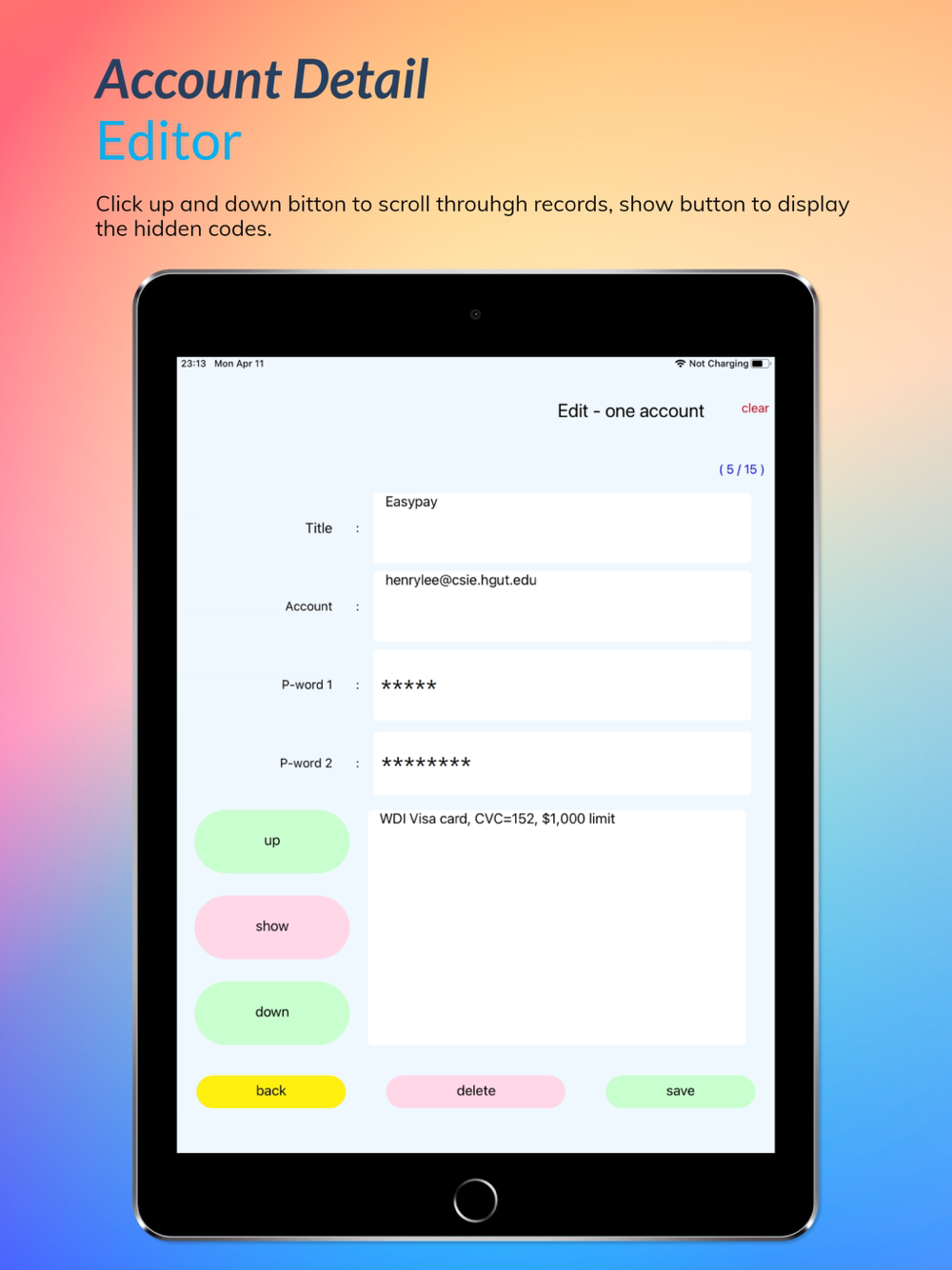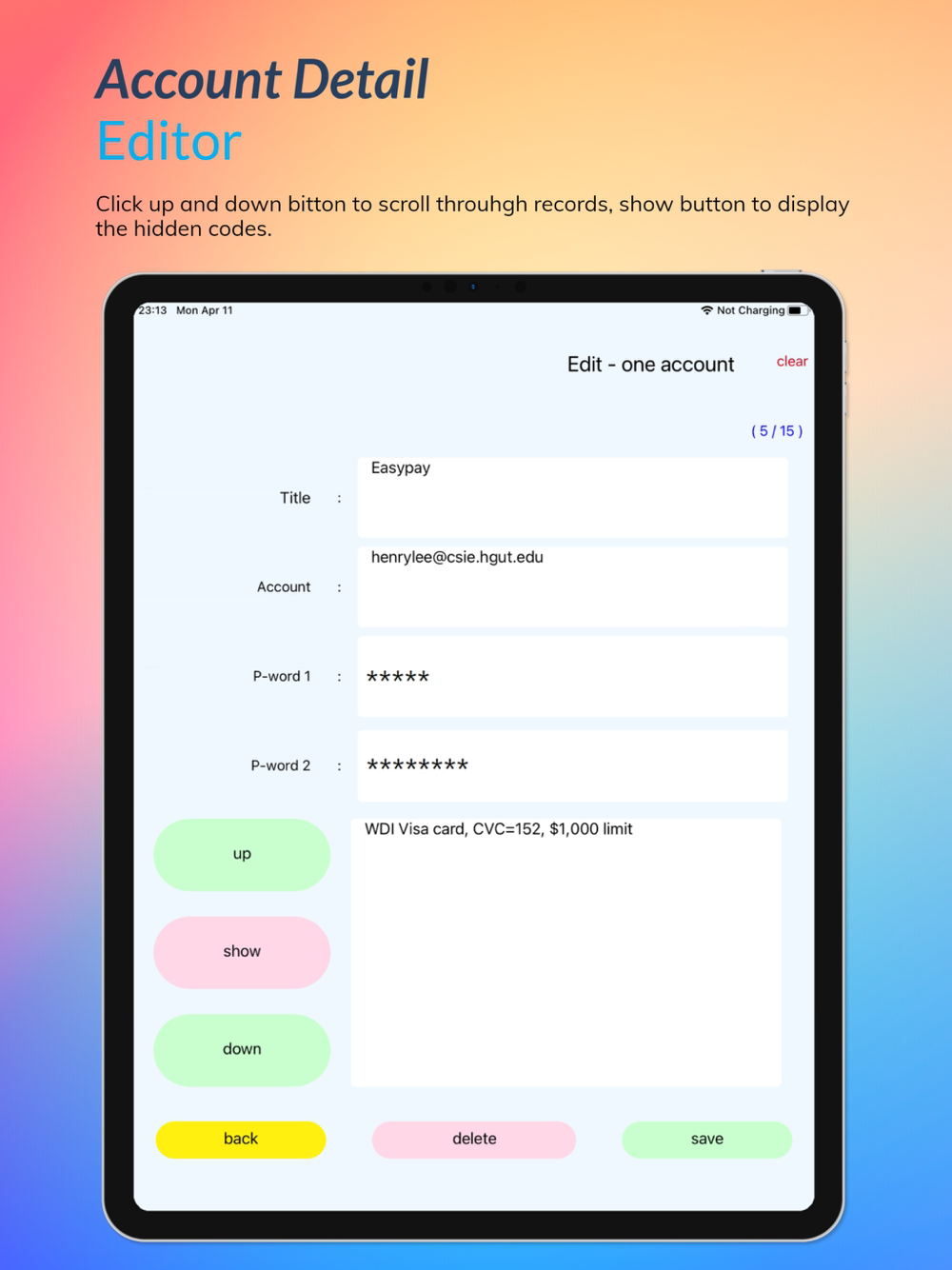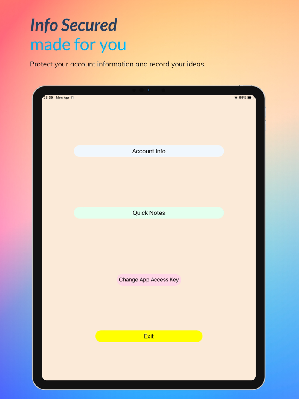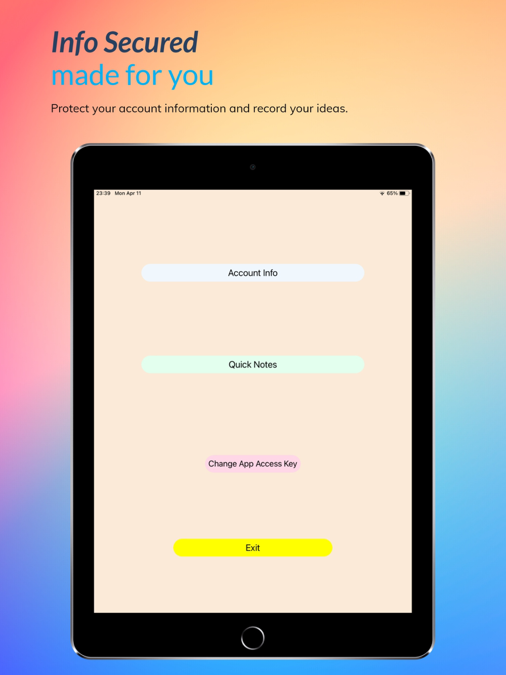 The app, Info Secured, provides two functions, account info and quick notes. Account information runs like a protected data book keeping all account data in detail. Quick note is just as its name for easy notes. The app takes 2 measures to protect user’s information and keep user in charge. One measure equips the app with a login page. The other measure activates timer to put the app at a secured state.
