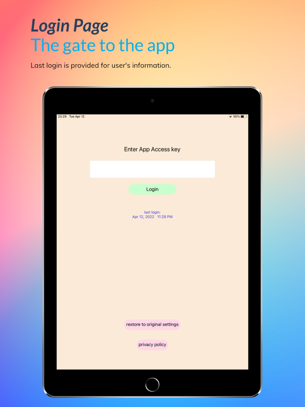 To keep data secured, it is a good practice to exit app application right after use. (or switch to login page, this is the case in this app.) A timer, defaulted 5 minutes, is activated when entering any page except login page. While the app is left unattended and/or running in background, the timer keeps running. When time is up, the app goes to the login page, a safe state. While timer is counting, if any button is press, the timer restarts counting from zero.