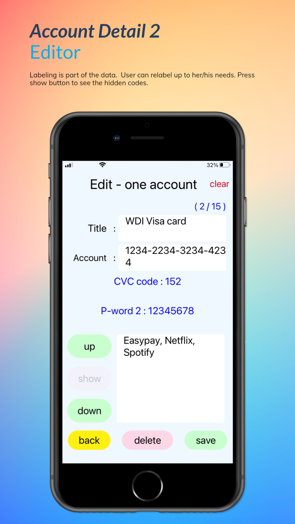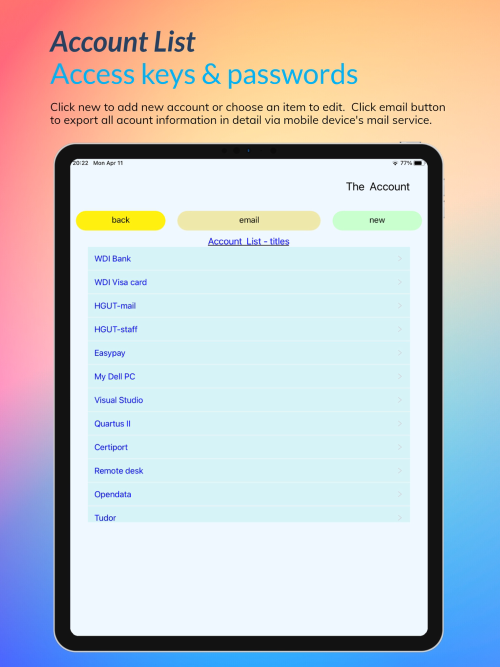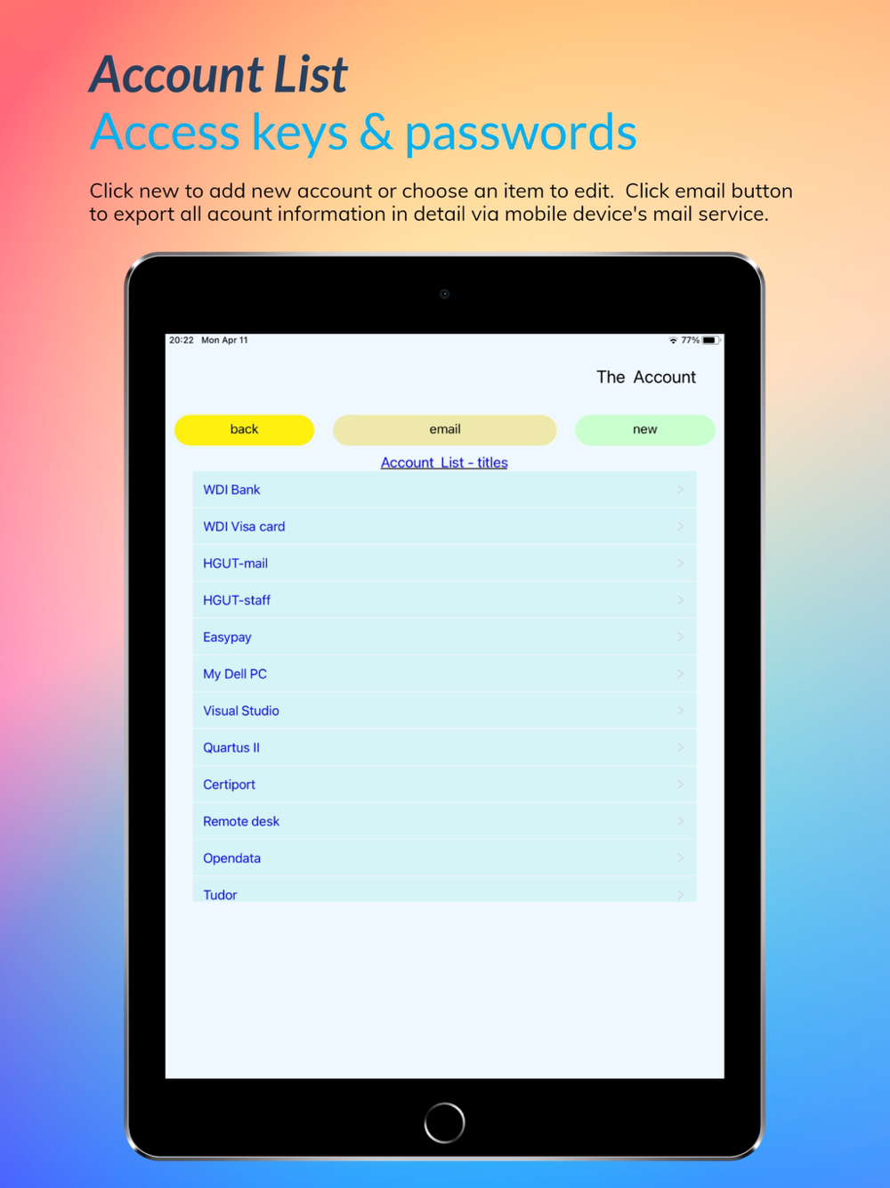 The entry of Account info function is a list view of the titles of all recorded accounts. User chooses an item to edit an existing account or clicks “new” button to add a new record.