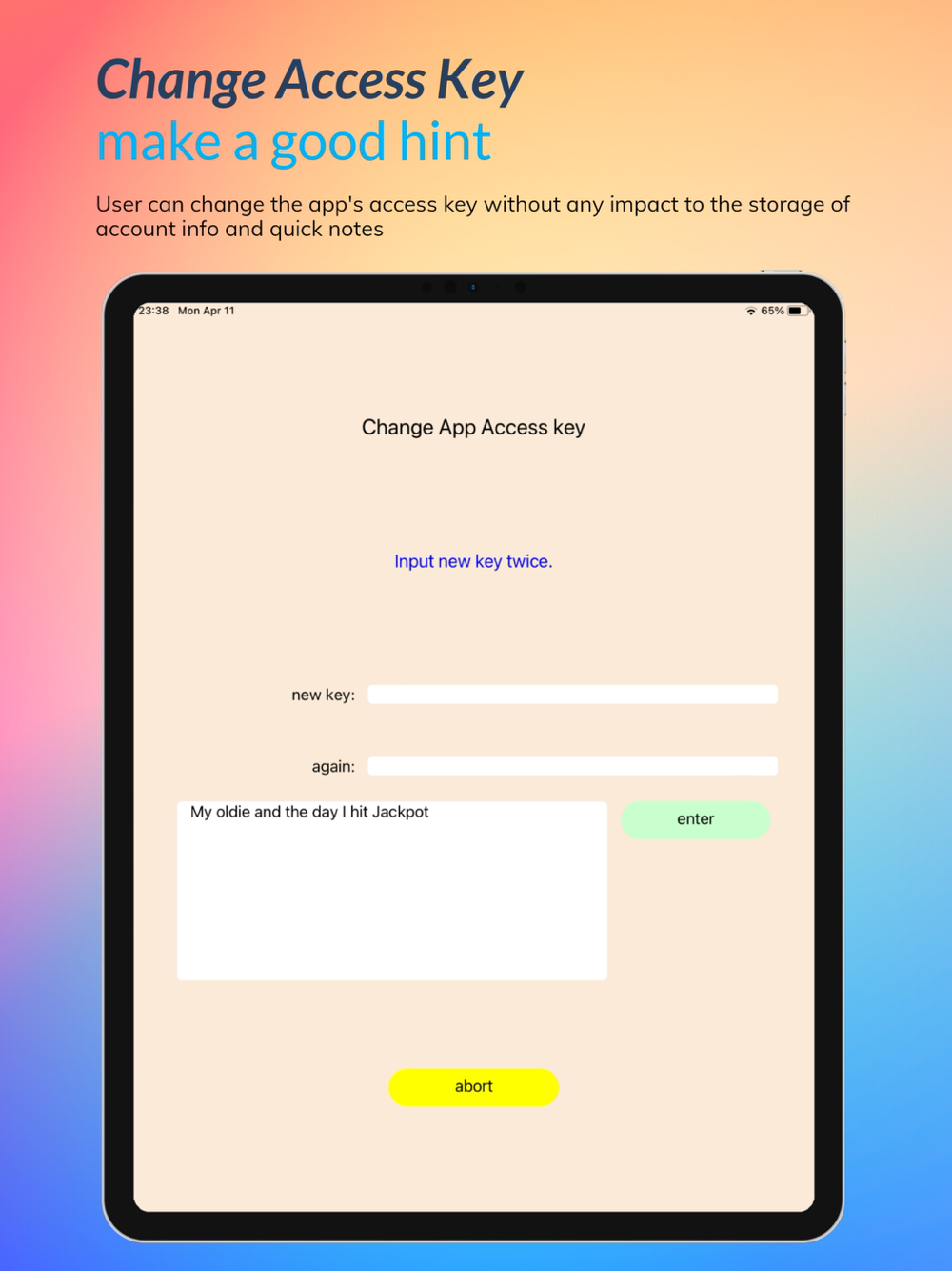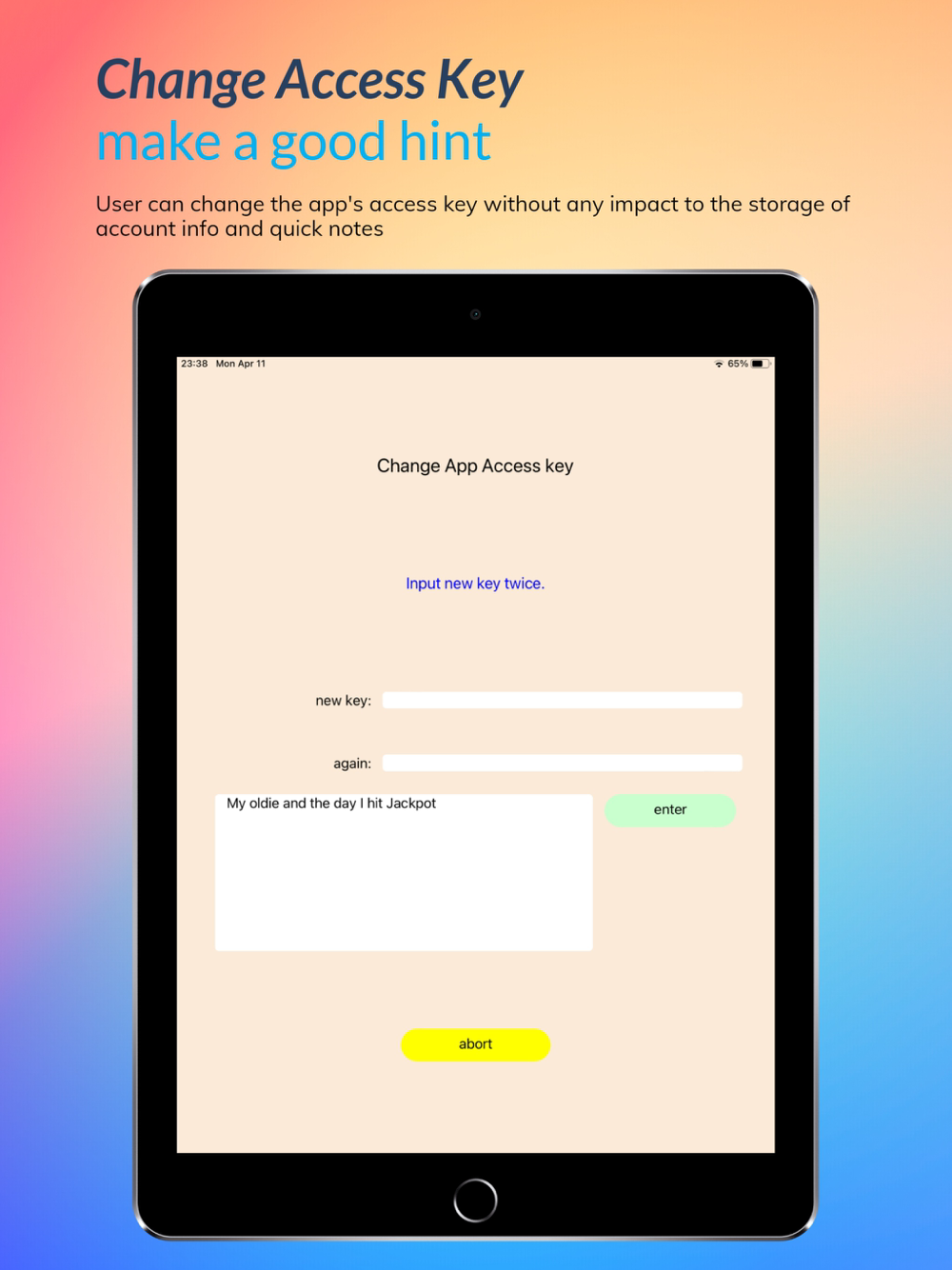 To change app access key, user logins the app properly first, inputs the new key twice and gives a hint. User should keep the access key in a safe way. If user cannot recollect the access key by any means, user can only restore the app to its original setting.