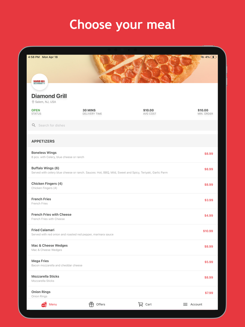 Online food and drink ordering app. Diamond Grill and Restaurant is the best place in town! Whether you are craving a breakfast, subs, hoagies, salads or burgers; we have the right plate for you! We also have the best pizza.