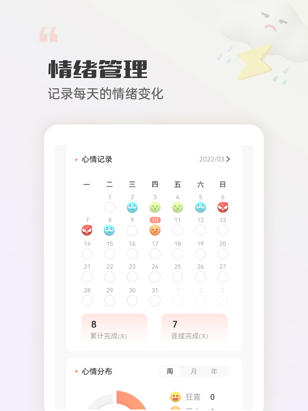 [情绪管理]小晴会帮你记录每日心情,观察与追踪情绪的变化,找到并分析出现“ 坏情绪”的原因,告诉你如何应对坏情绪的方法。
