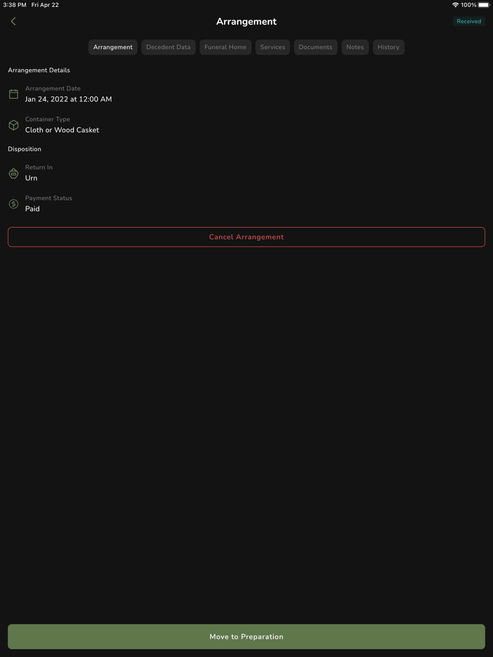 Displays the most important information about cremation arrangements in the palm of your hand.