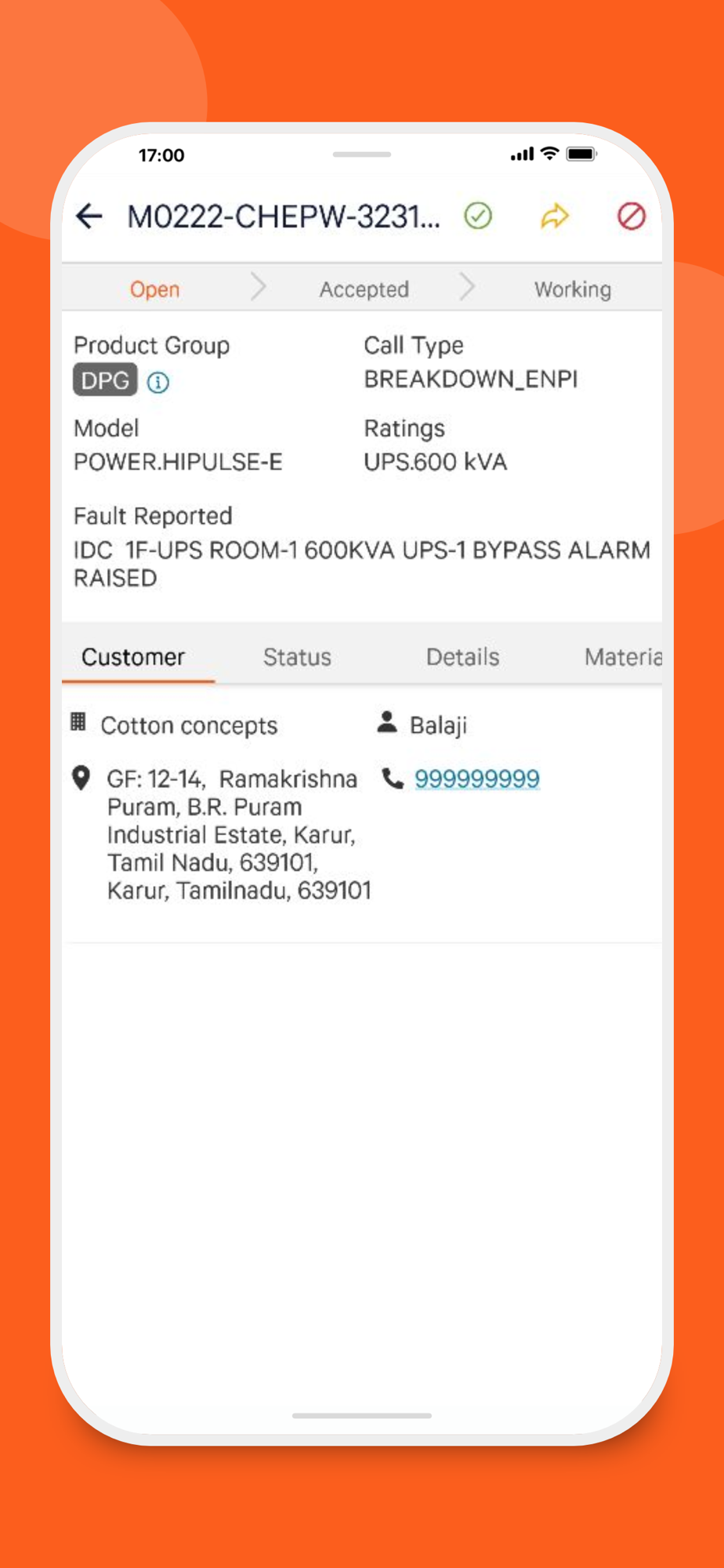 The customer Engineer instantly gets customer call logged ticket details assigned from the Call Center in the App.