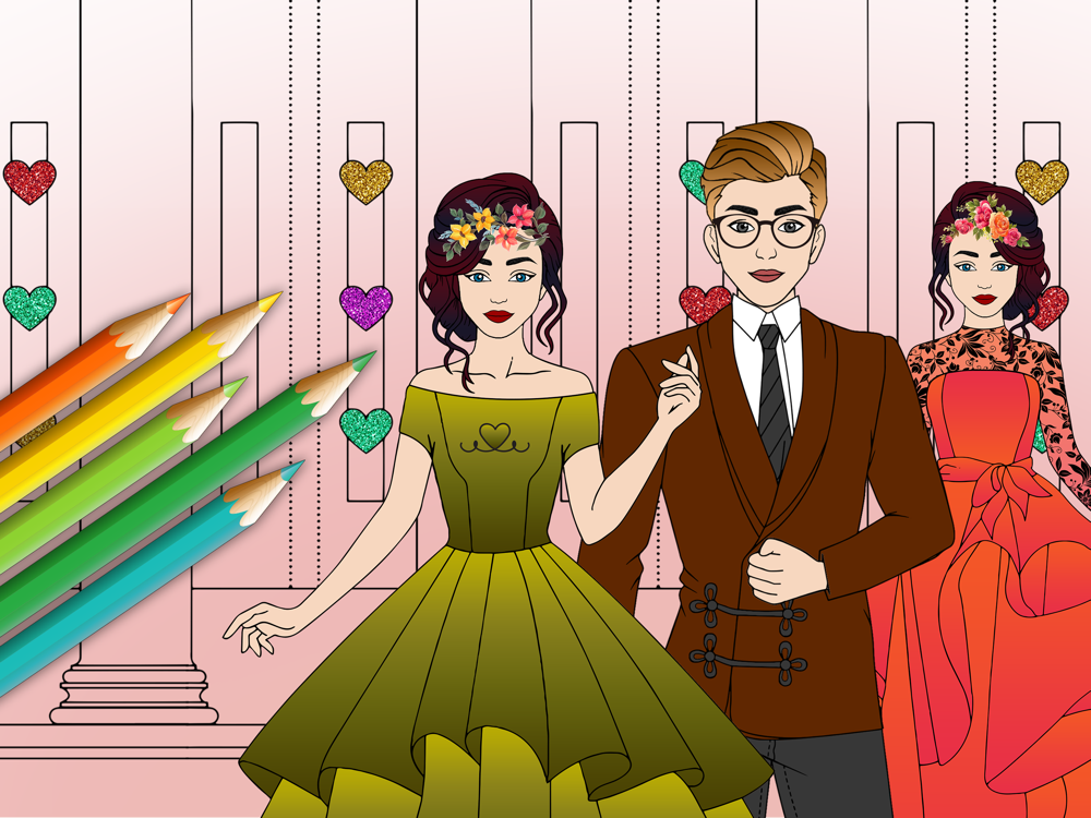 This app brings wedding dress up and coloring games for girls to the next level and combines them with wedding fashion coloring book games. Choose and paint bride and groom’s clothes, skin, hair and makeup in any color or glitter, become a wedding stylist in the wedding bride games. Select the background and enjoy an endless amount of free coloring pages for girls and adults!